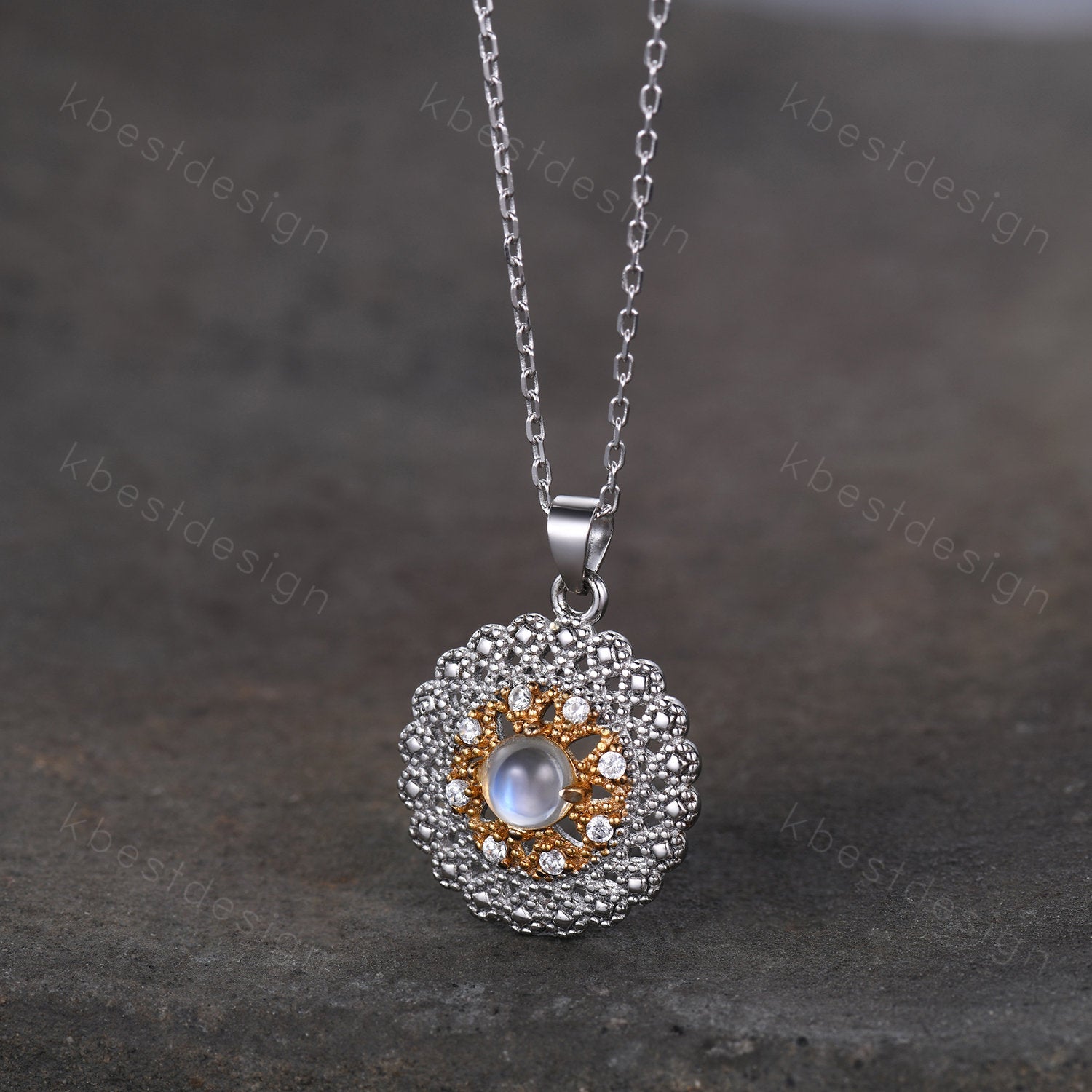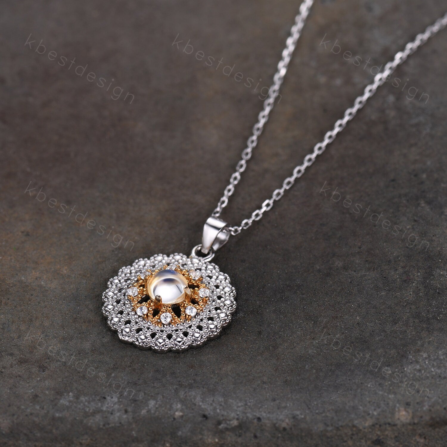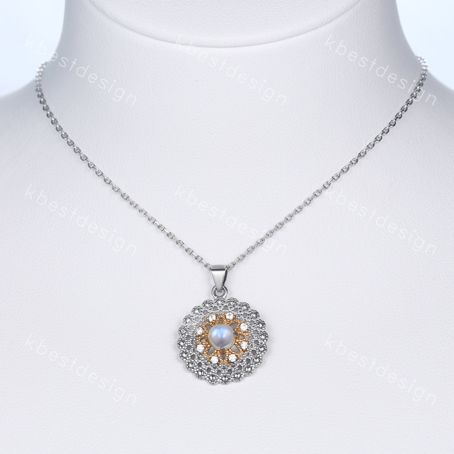 This Moonstone necklace is the June birthstone, features 4mm round shaped moonstone center stone surrounded by Moissanite. For those who are looking for moonstone jewelry which is handcrafted in details, this unique moonstone necklace would be a perfect choice for you. Whether it be a Birthday gift for her, an anniversary gift her, or a celebration of yourself, this agate jewelry is the perfect gift from the heart.