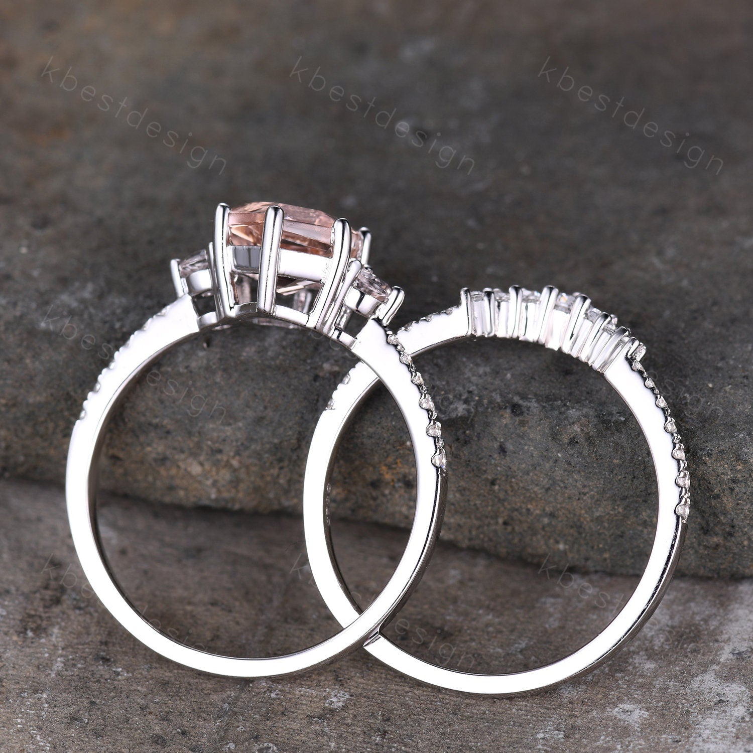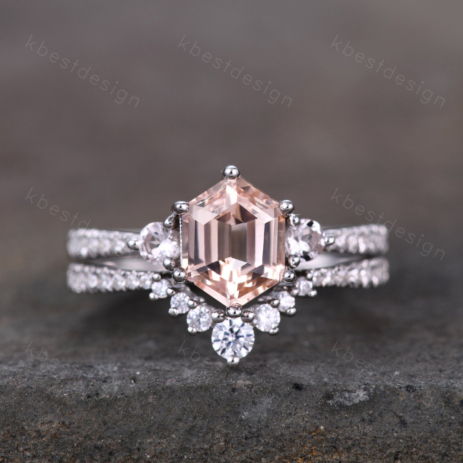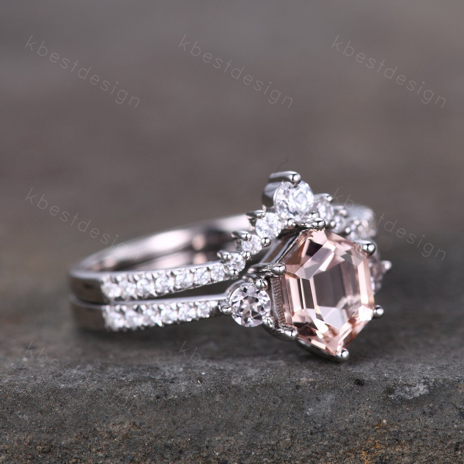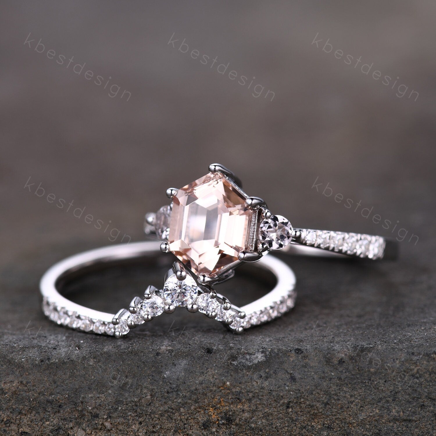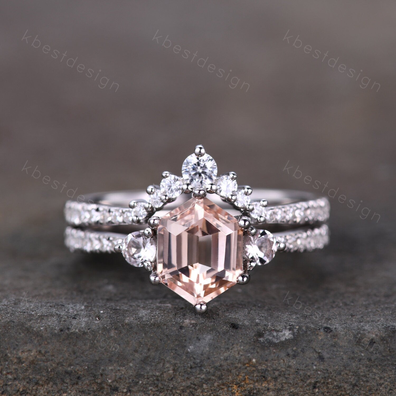 This is a beautiful hexagon natural peach morganite and CZ diamond engagement ring SET in 925 sterling silver.