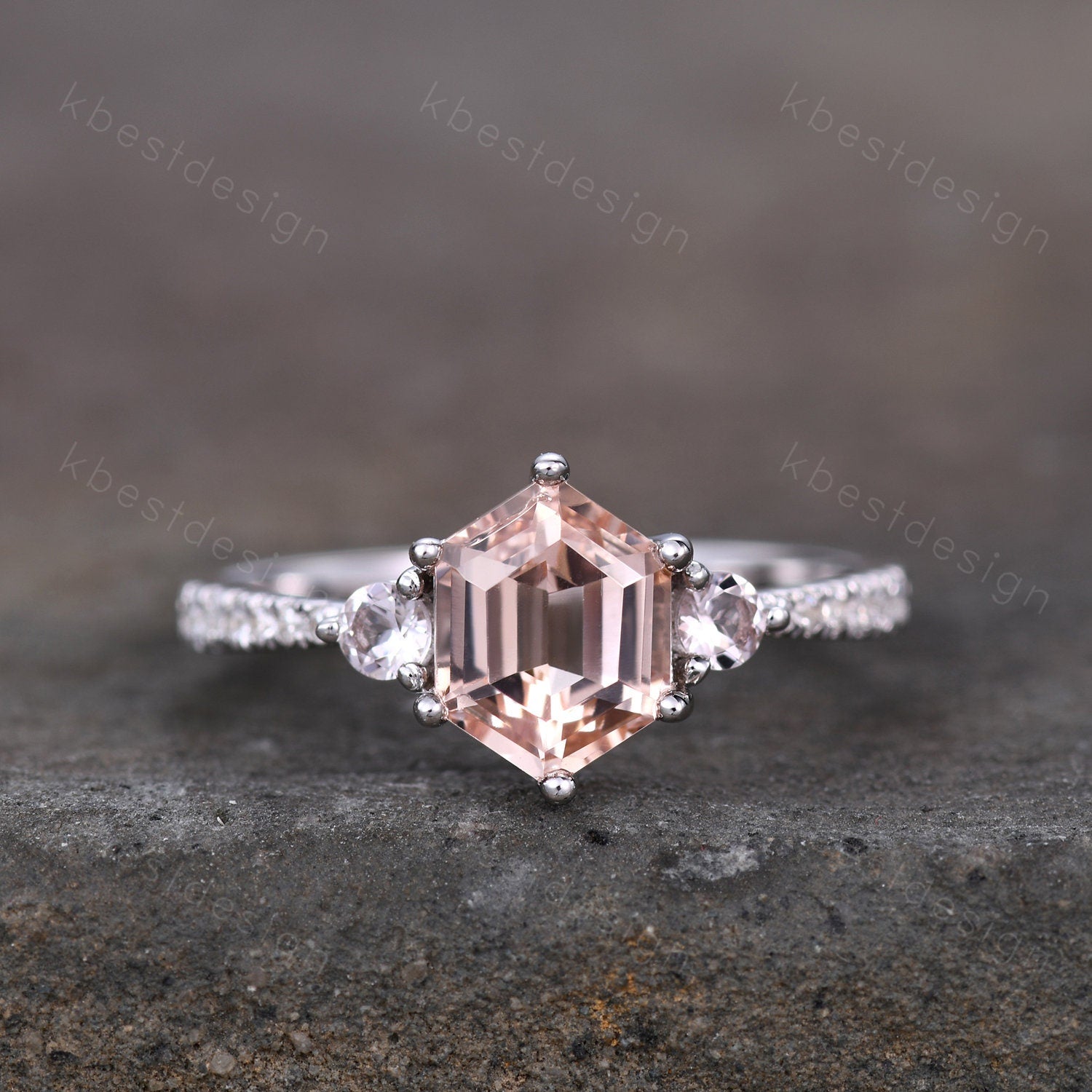 Main Stone: 7x6mm hexagon cut natural peach morganite.