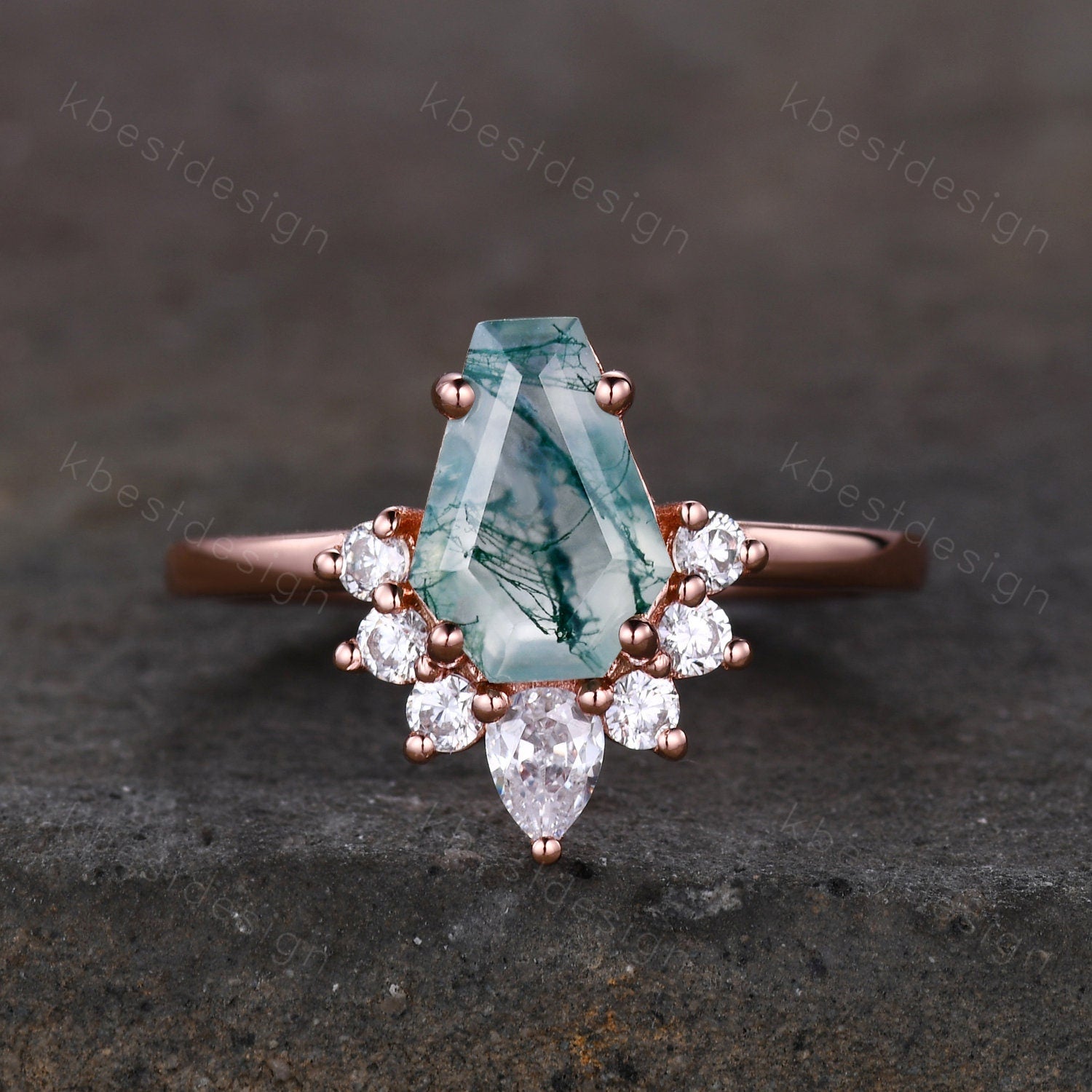 Vintage Moss Agate engagement ring Rose gold Coffin shaped Ring Unique pear moissanite ring Art deco prong set anniversary ring Women Gift