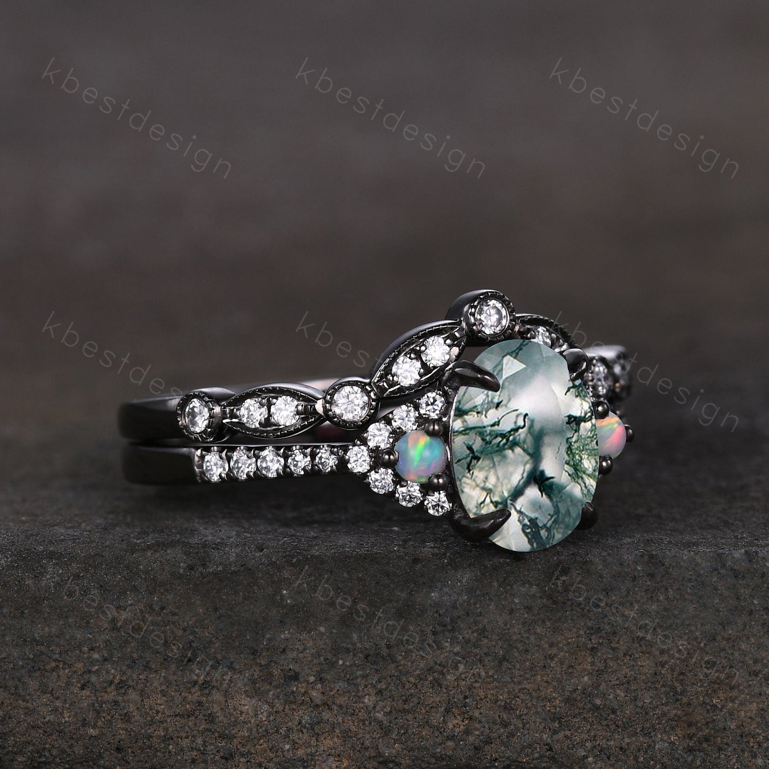 This is a Vintage moss agate engagement ring set black gold green moss agate ring unique curved Moissanite stacking band oval cut bridal wedding set