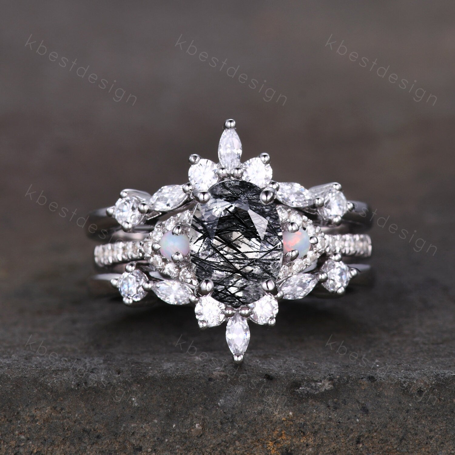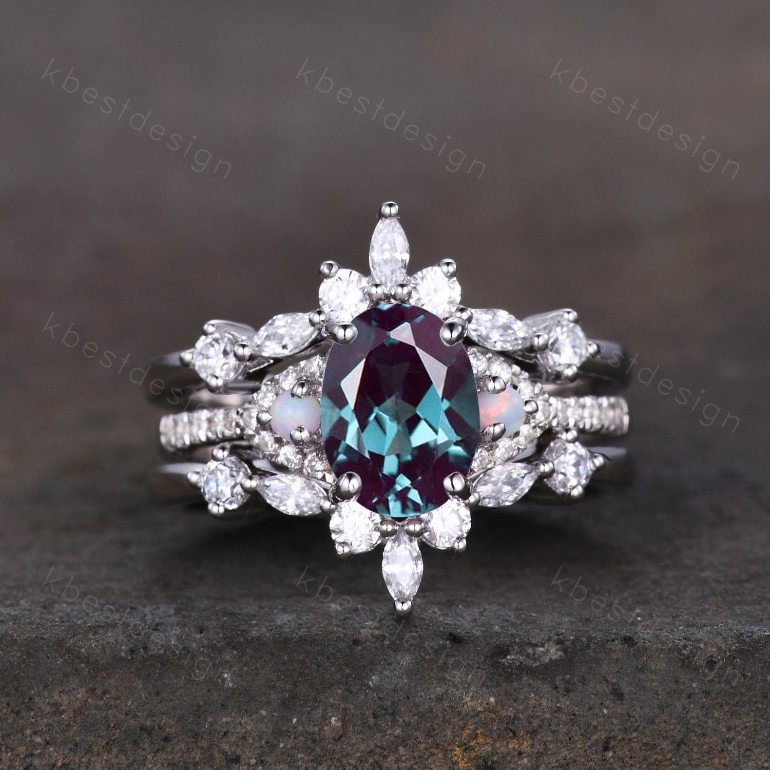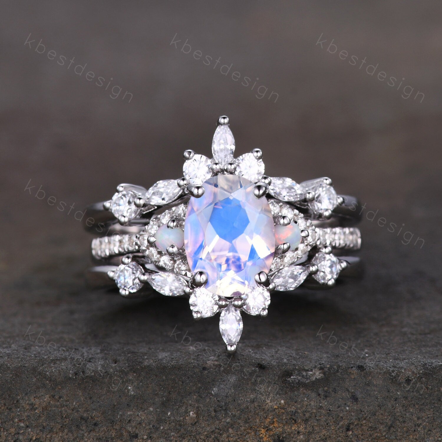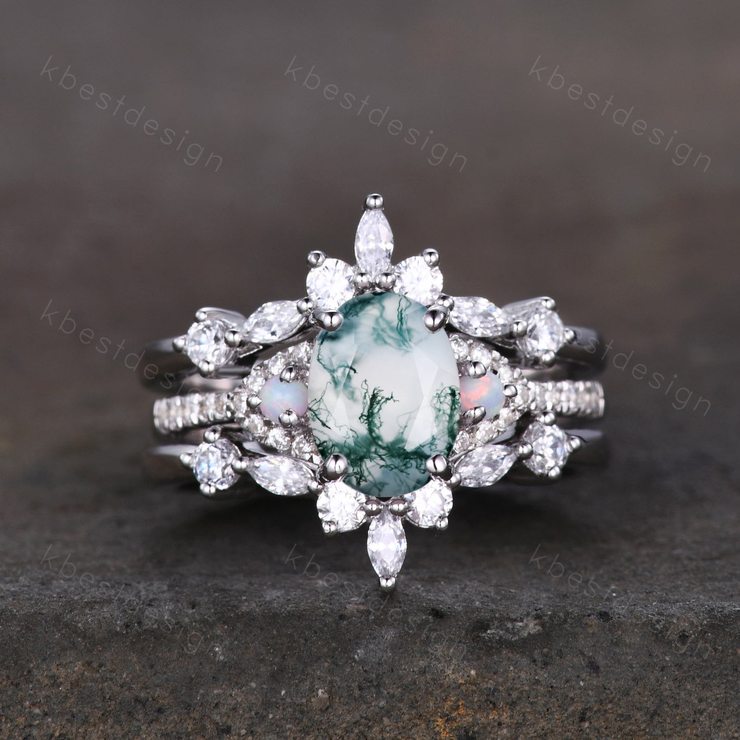 Vintage Moss Agate Engagement Ring Set Oval Engagement Ring Vintage Marquise cut Diamond Cluster ring Unique Bridal Set Promise Gift
