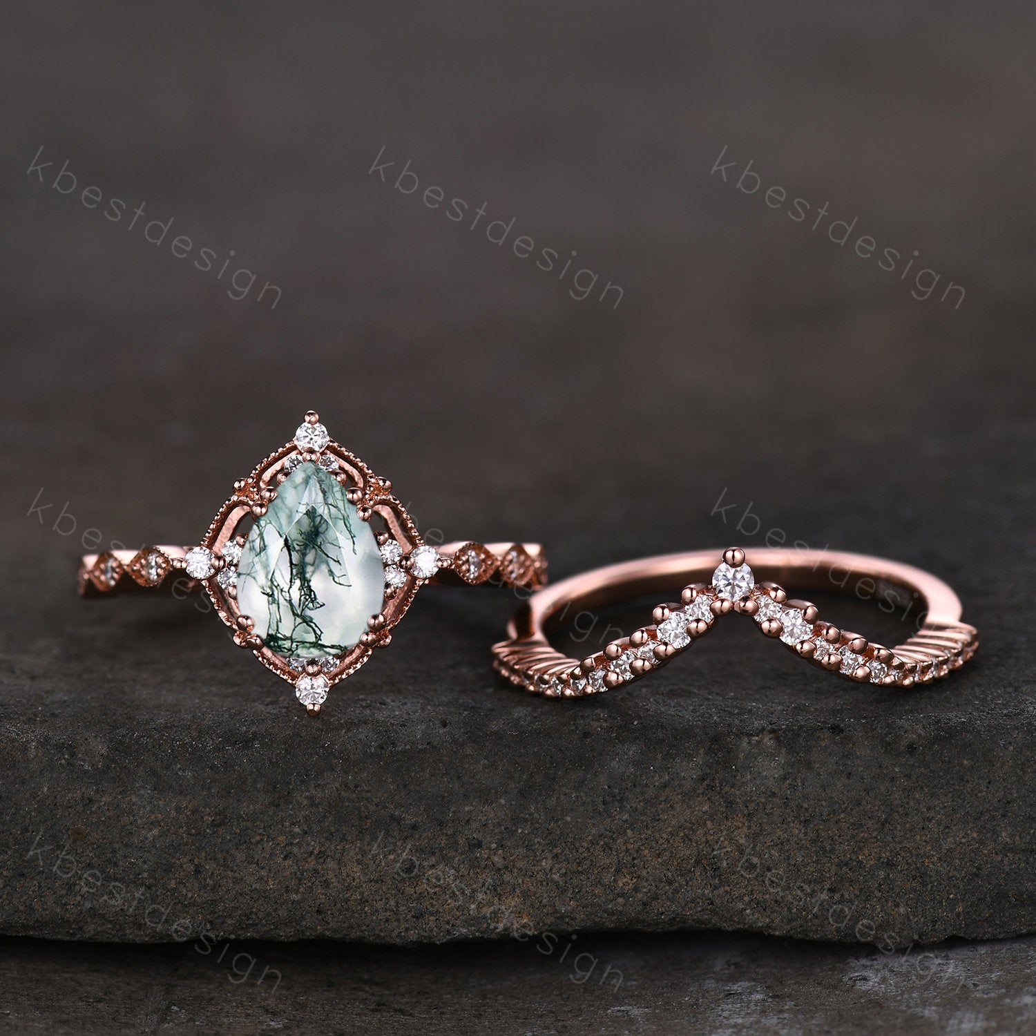 This is a beautiful pear shaped green moss agate and moissanite engagement ring SET in rose gold.