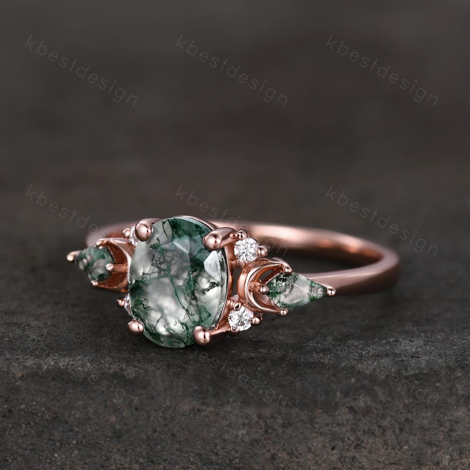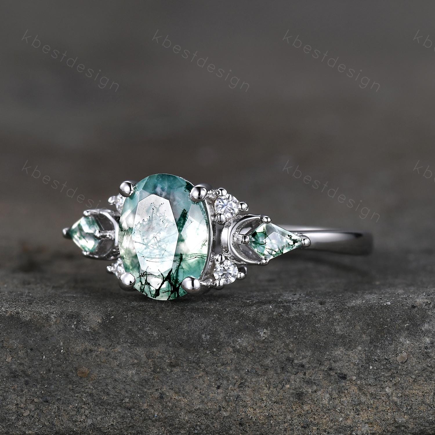 Vintage moss agate engagement ring unique promise ring for women crescent style ring kite cut moss agate cluster ring bridal ring