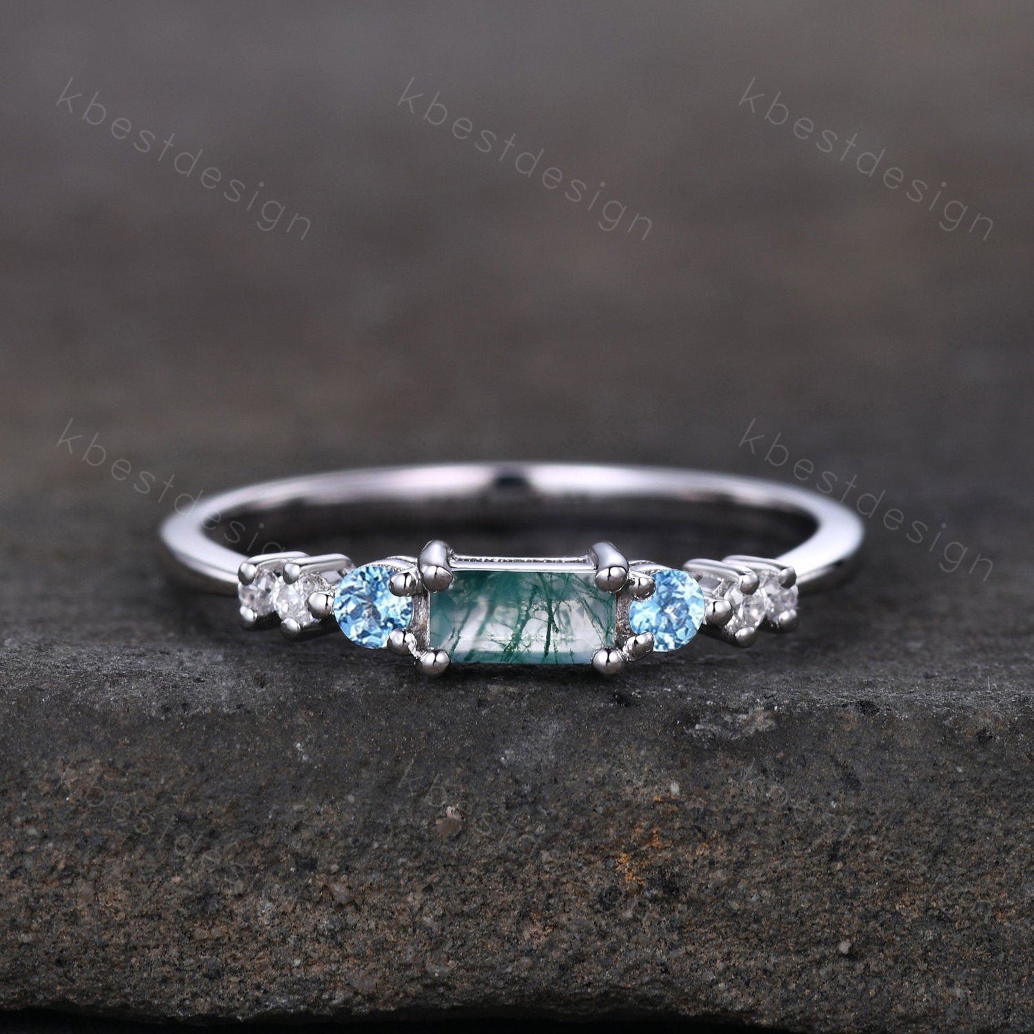 Unique baguette shaped ring, wedding ring, promise ring, anniversary gift. Vintage moss agate wedding ring unique baguette cut ring art deco blue topaz wedding band 7 stone ring moissanite wedding ring for women