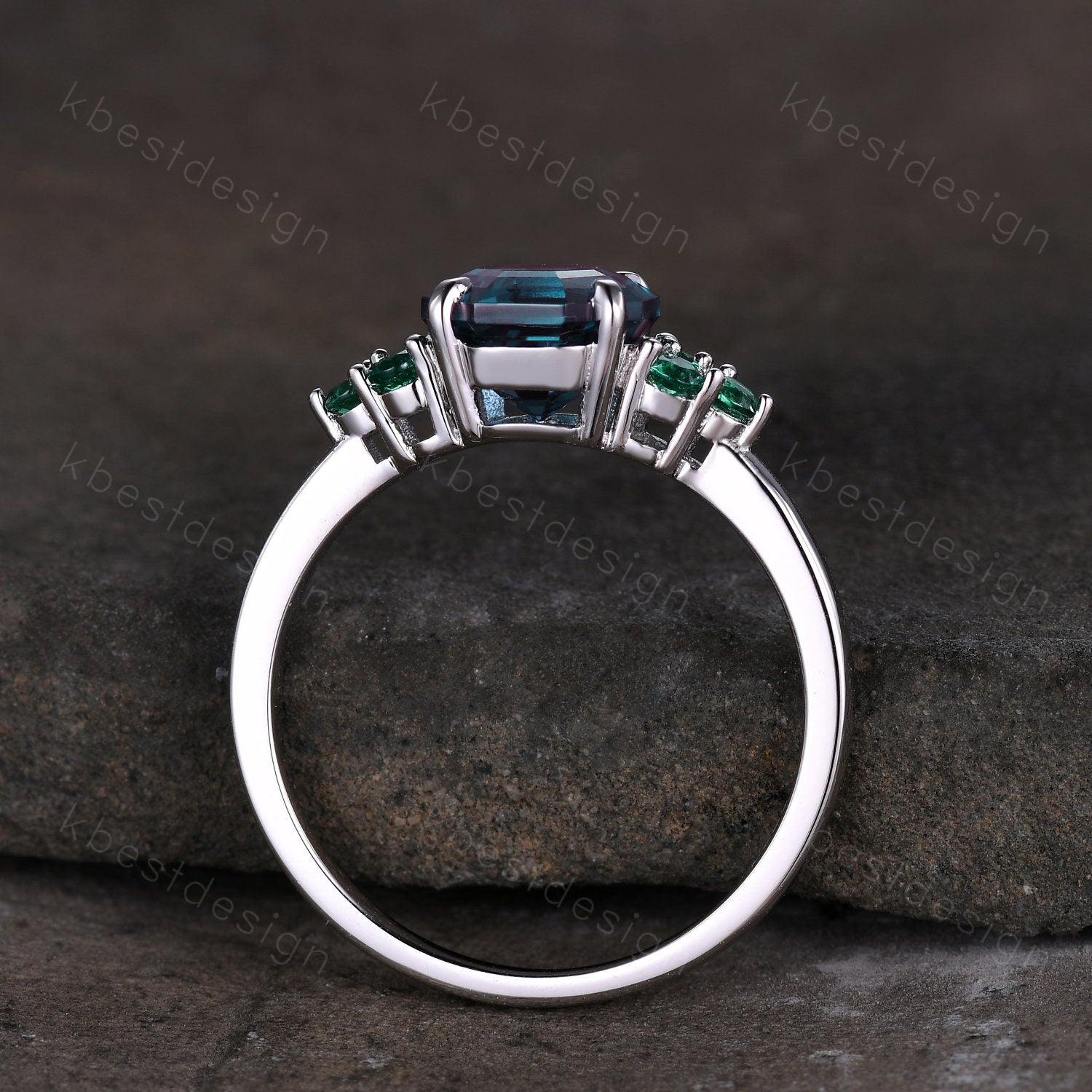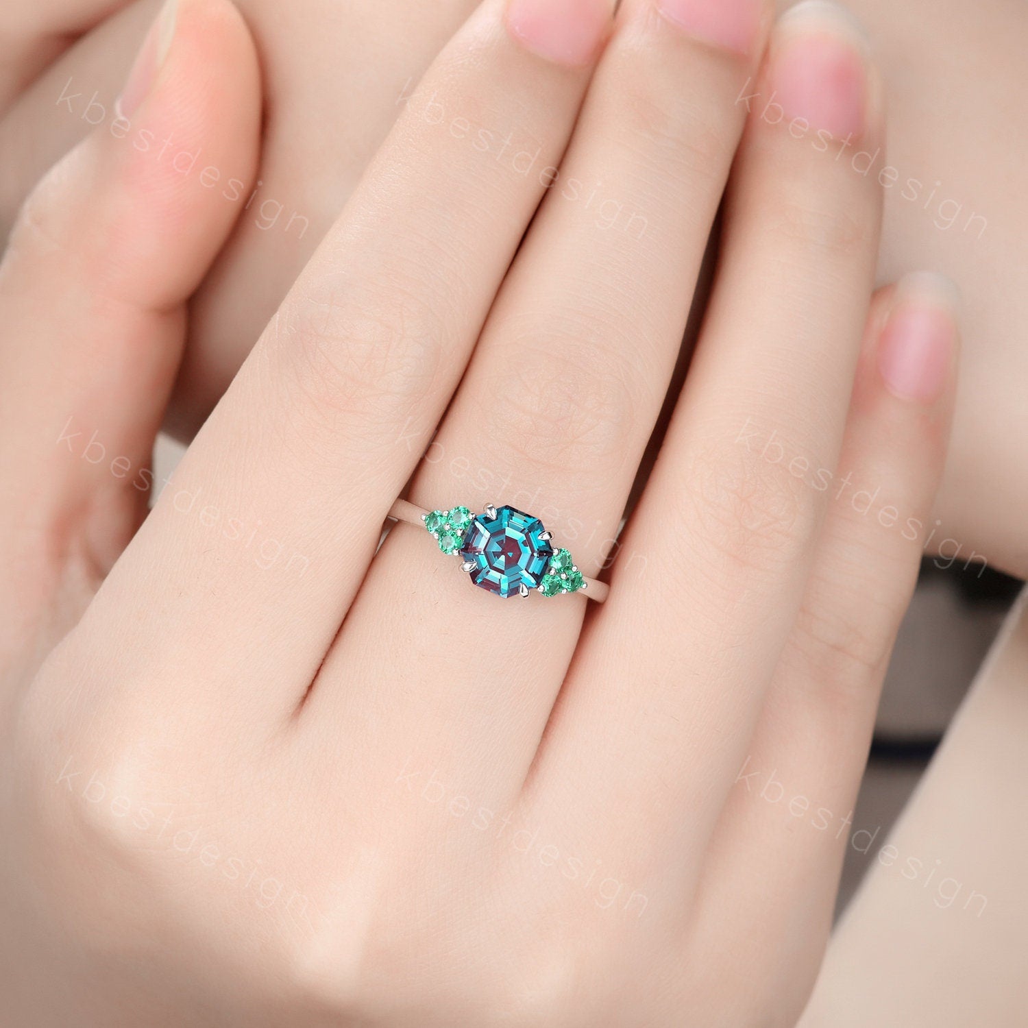 Vintage octagon cut Alexandrite engagement ring silver gold ring green emerald cluster ring unique wedding ring women anniversary ring gift