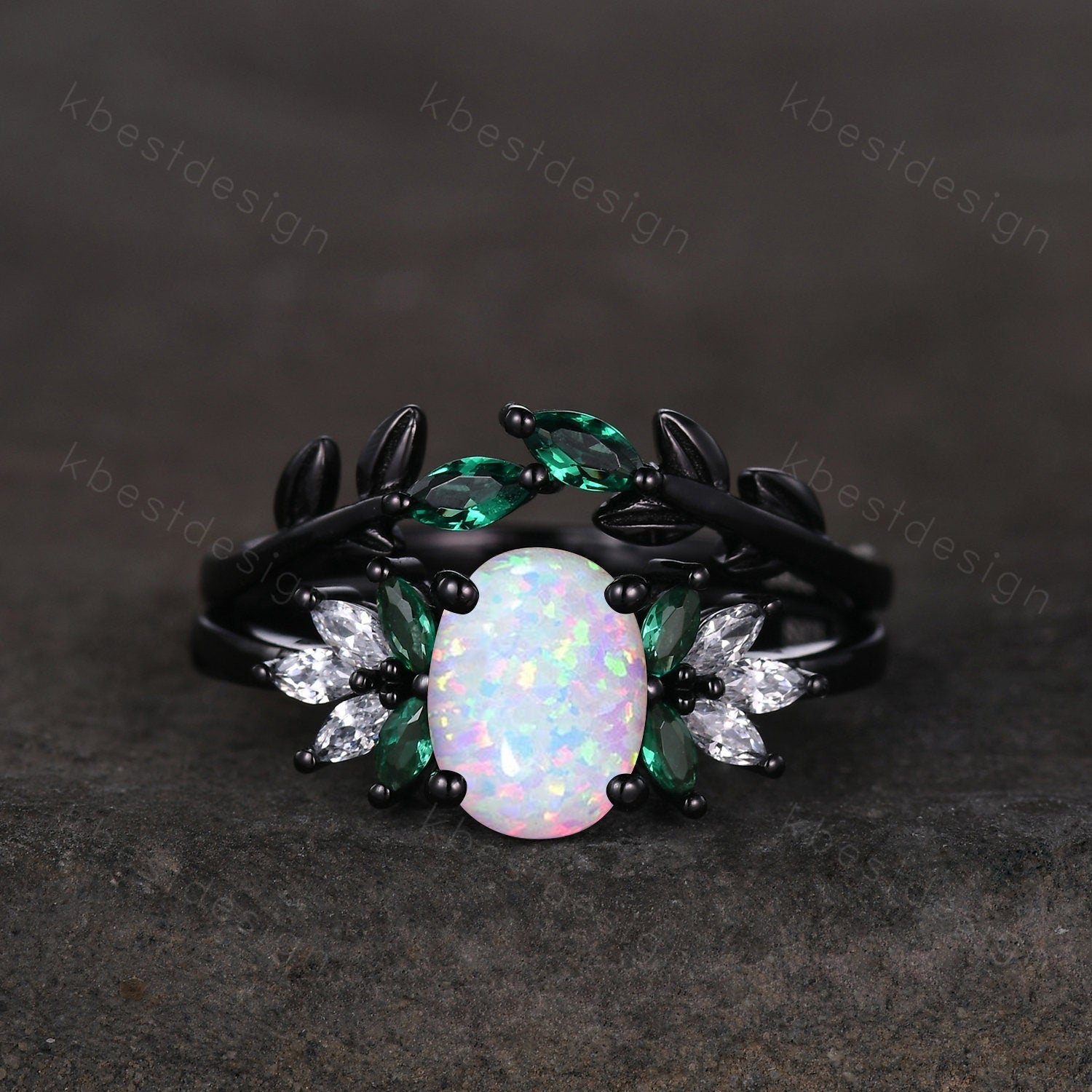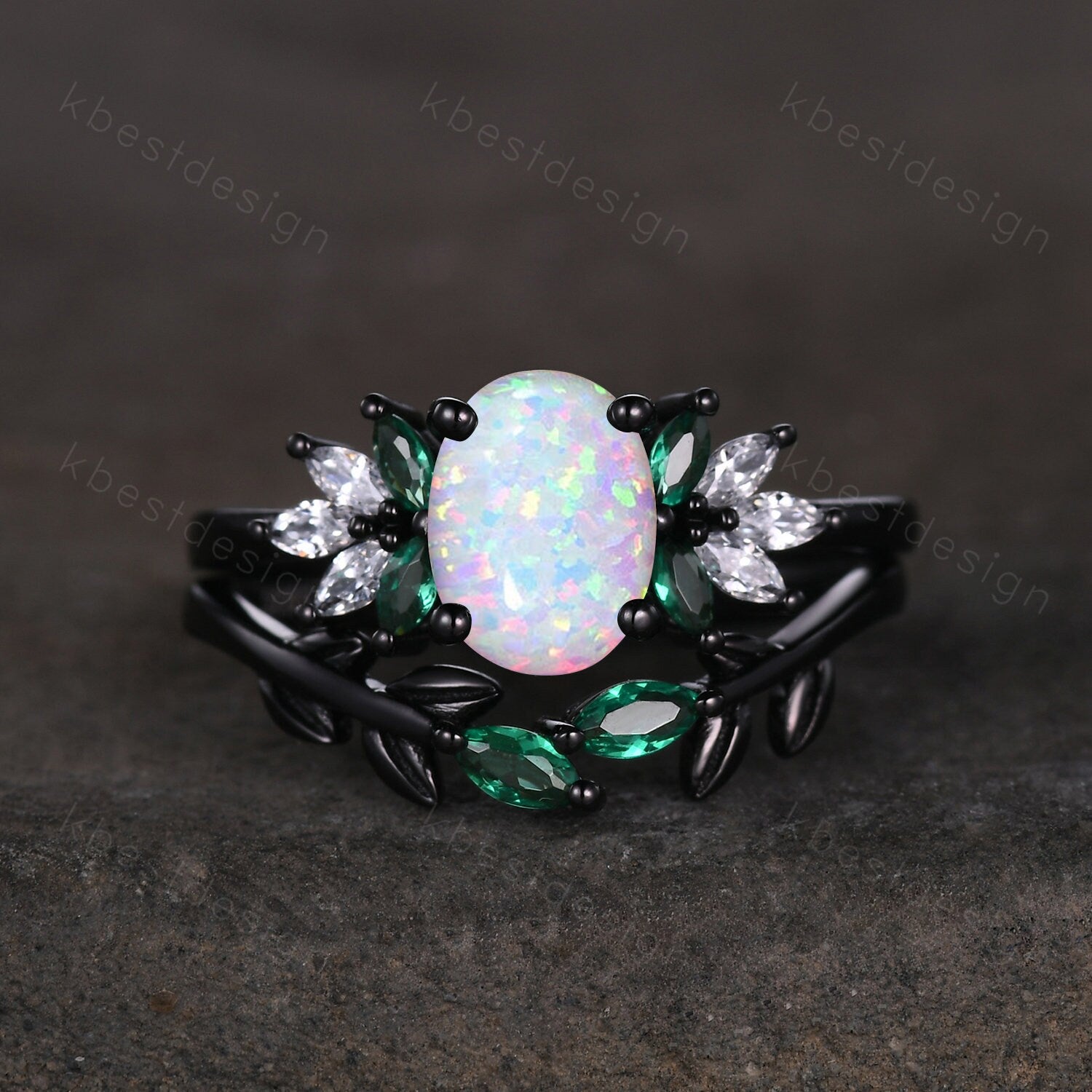 Vintage Opal Emerald Engagement Ring Unique Marquise Moissanite Cluster Ring Black Gold Ring Oval cut Bridal Set White Fire Opal Wedding Set