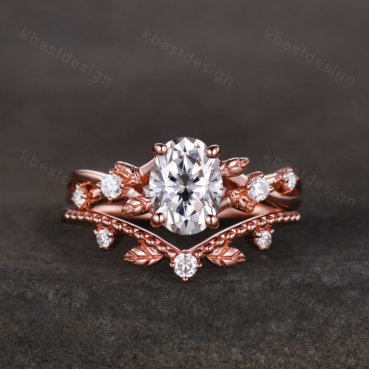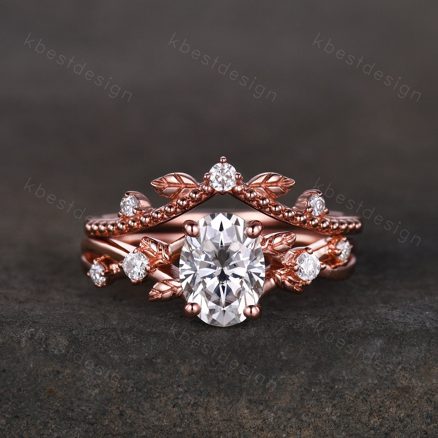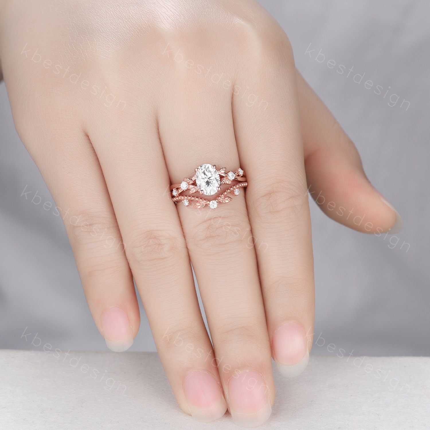 Vintage oval moissanite engagement ring set rose gold twig leaf stacking ring nature branch ring unique art deco bridal wedding ring set