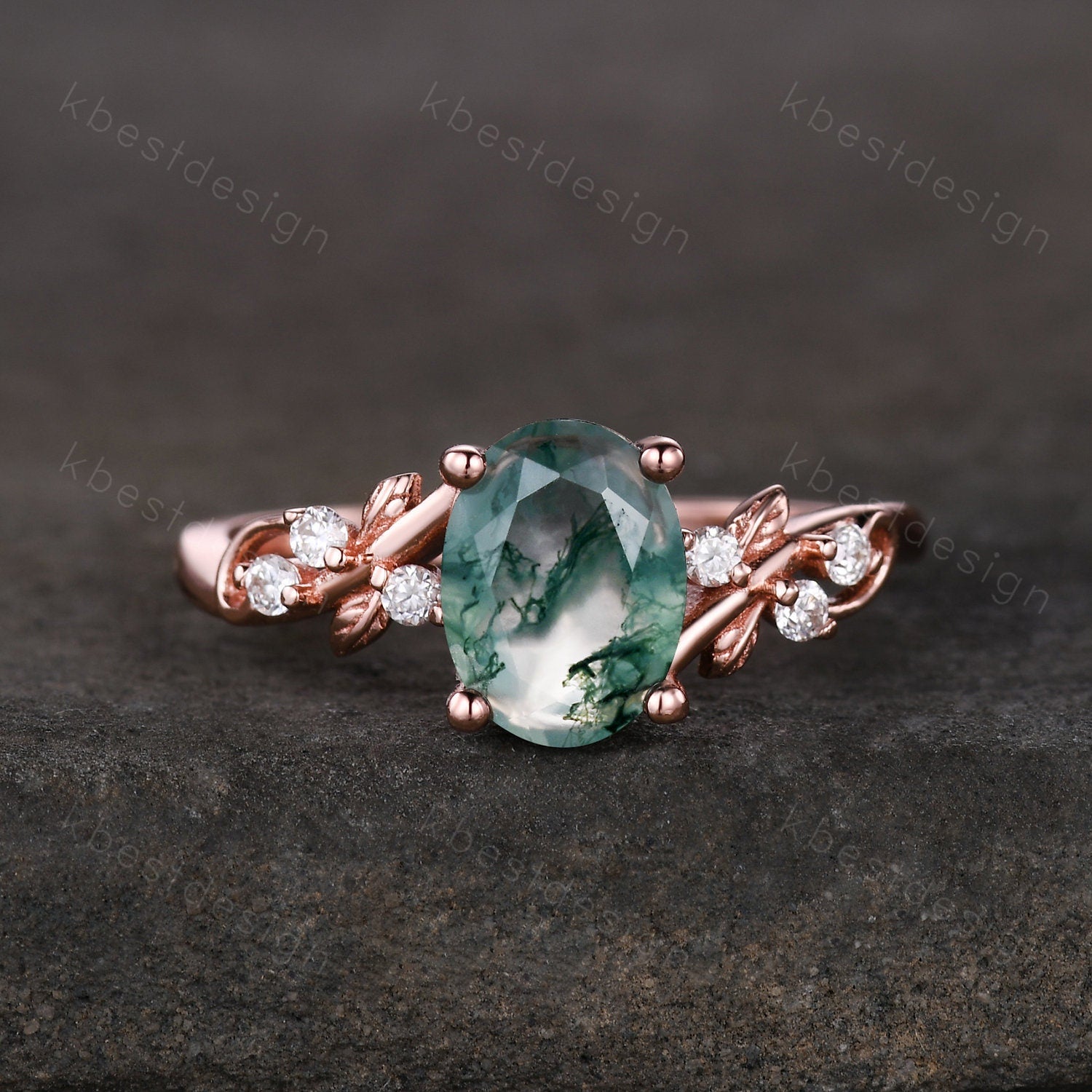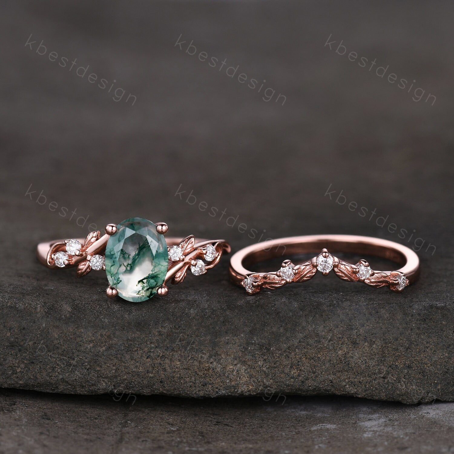 Vintage oval moss agate engagement ring set rose gold twig leaf moissanite ring nature branch ring unique art deco bridal wedding ring set