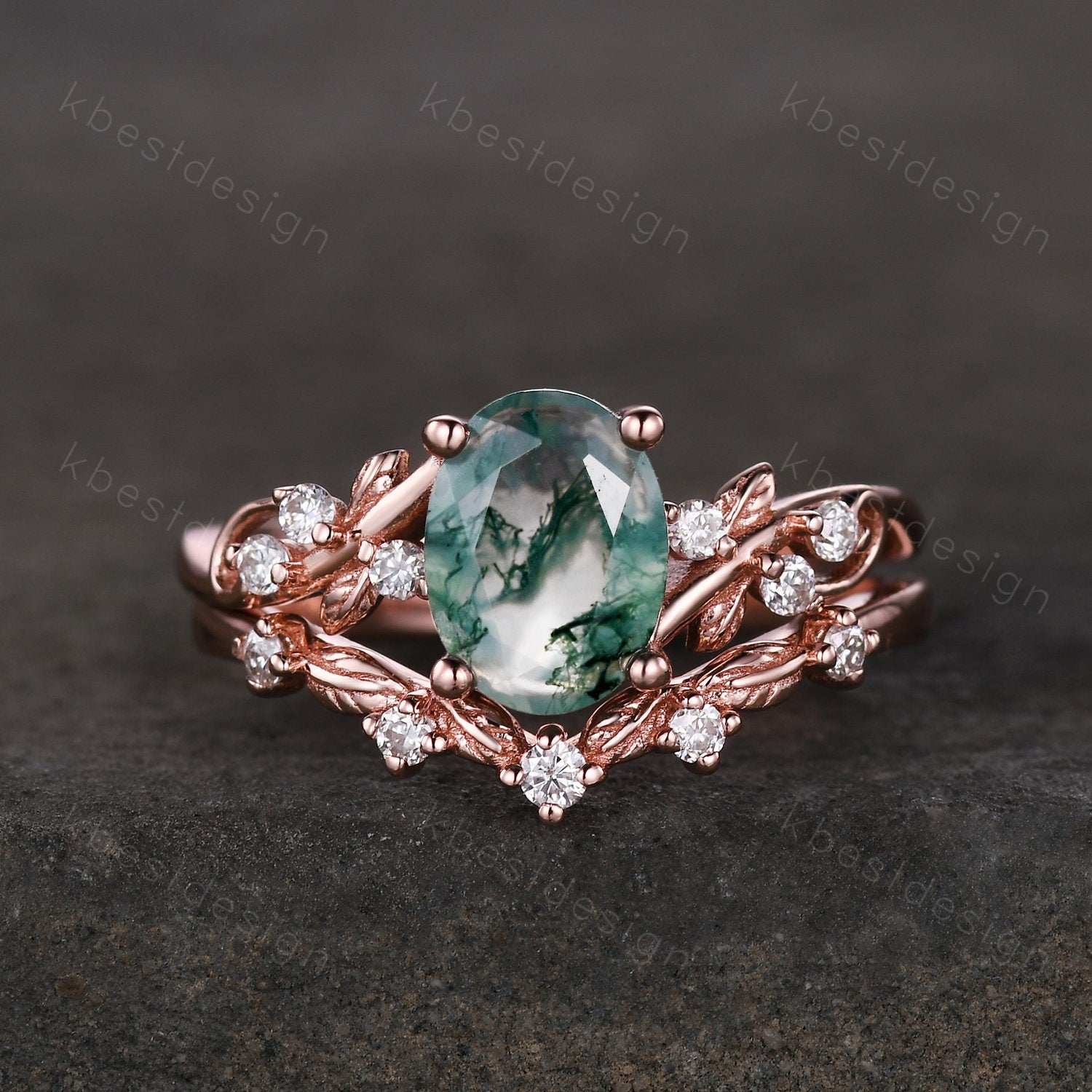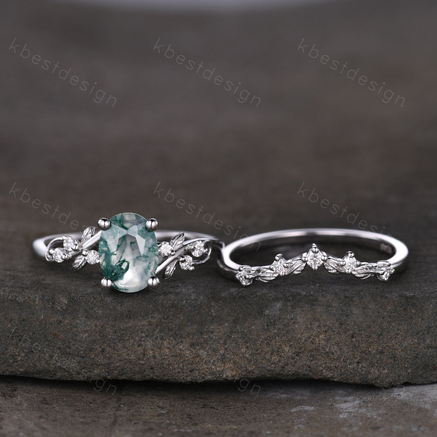 Vintage oval moss agate engagement ring set silver ring twig leaf moissanite ring nature branch ring unique art deco bridal wedding ring set