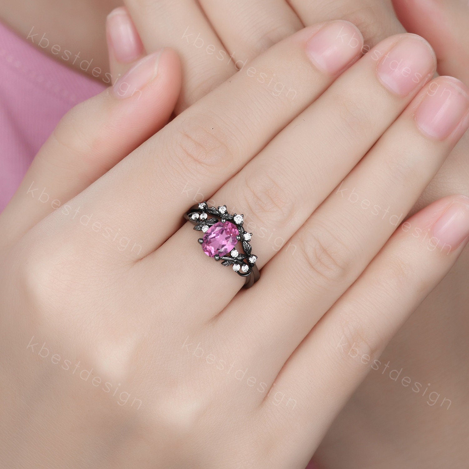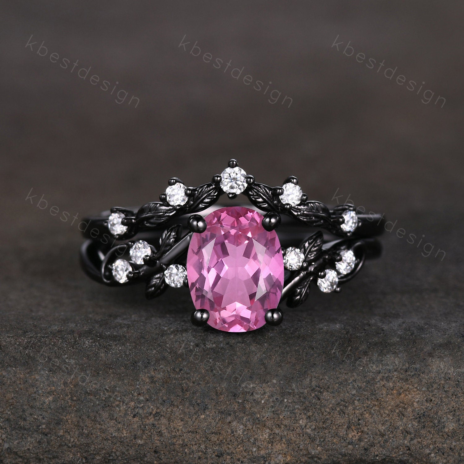 Vintage oval Padparadscha sappphire engagement ring set black gold twig leaf moissanite ring black pink ring unique bridal wedding ring set