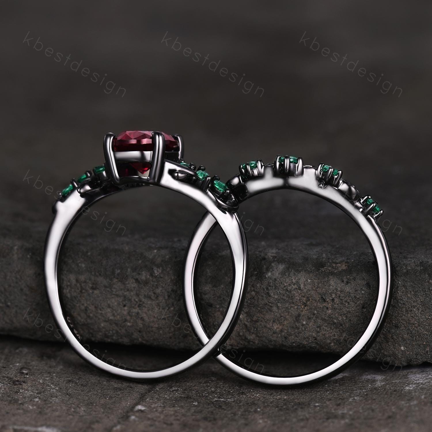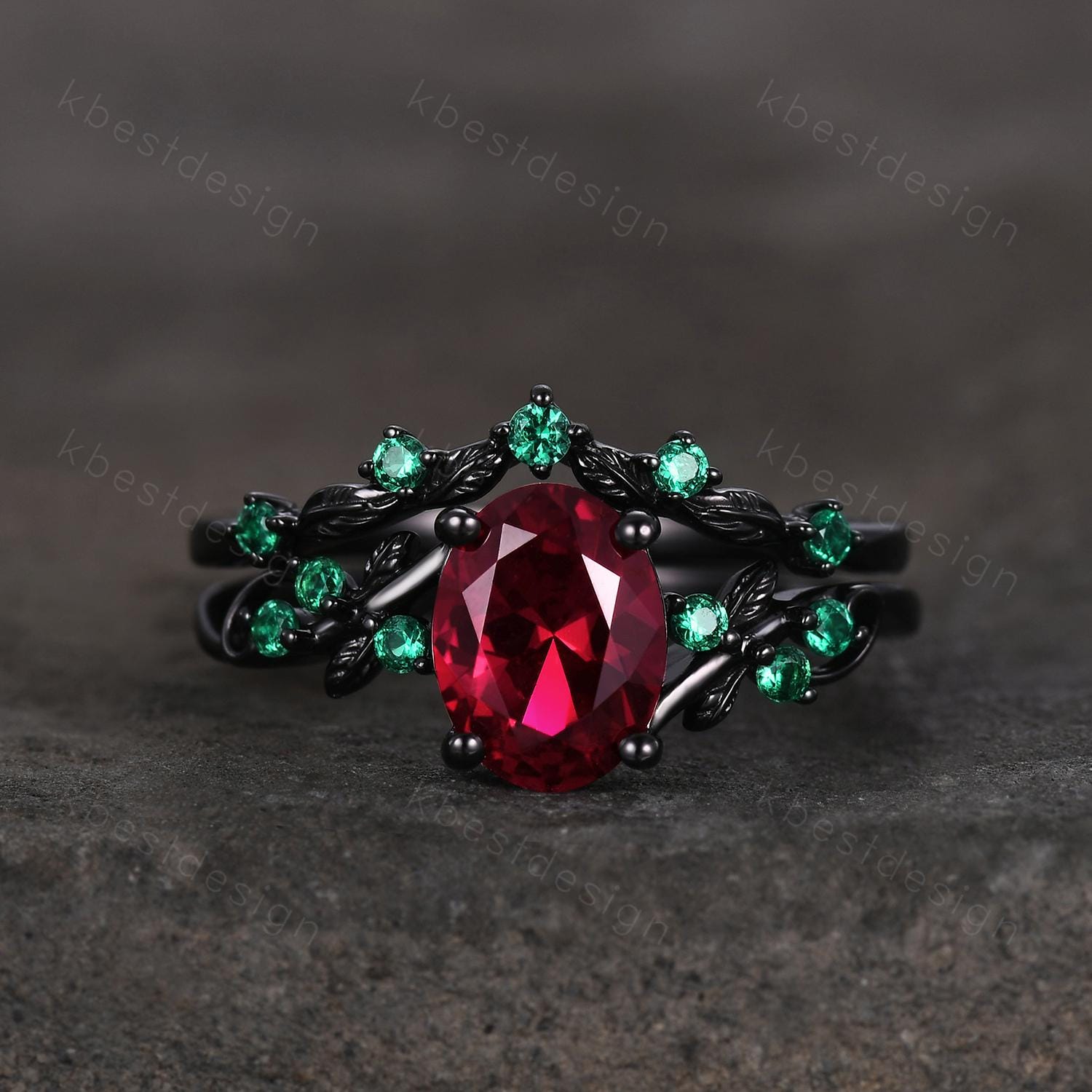 Vintage oval ruby engagement ring set black gold twig leaf emerald ring nature branch ring unique art deco bridal wedding ring set July ring