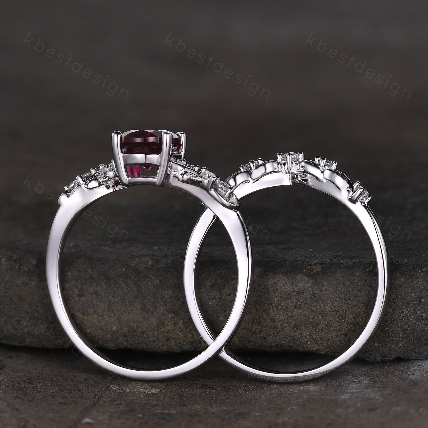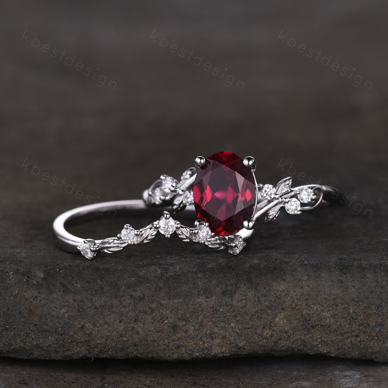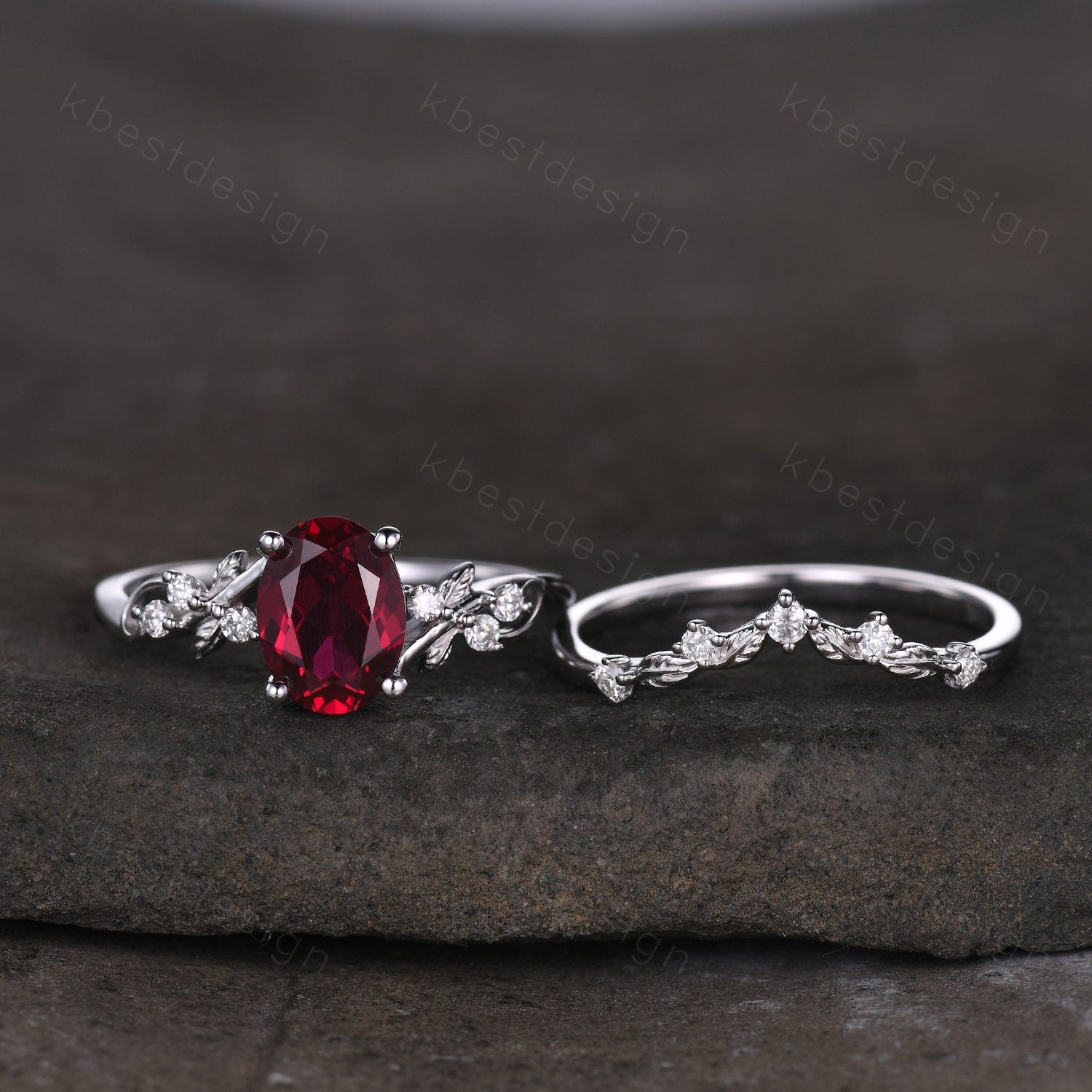 Vintage oval ruby engagement ring set silver ring twig leaf moissanite ring nature branch ring unique art deco bridal wedding ring set