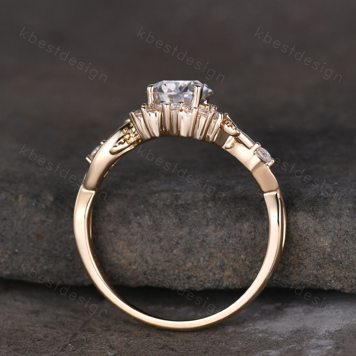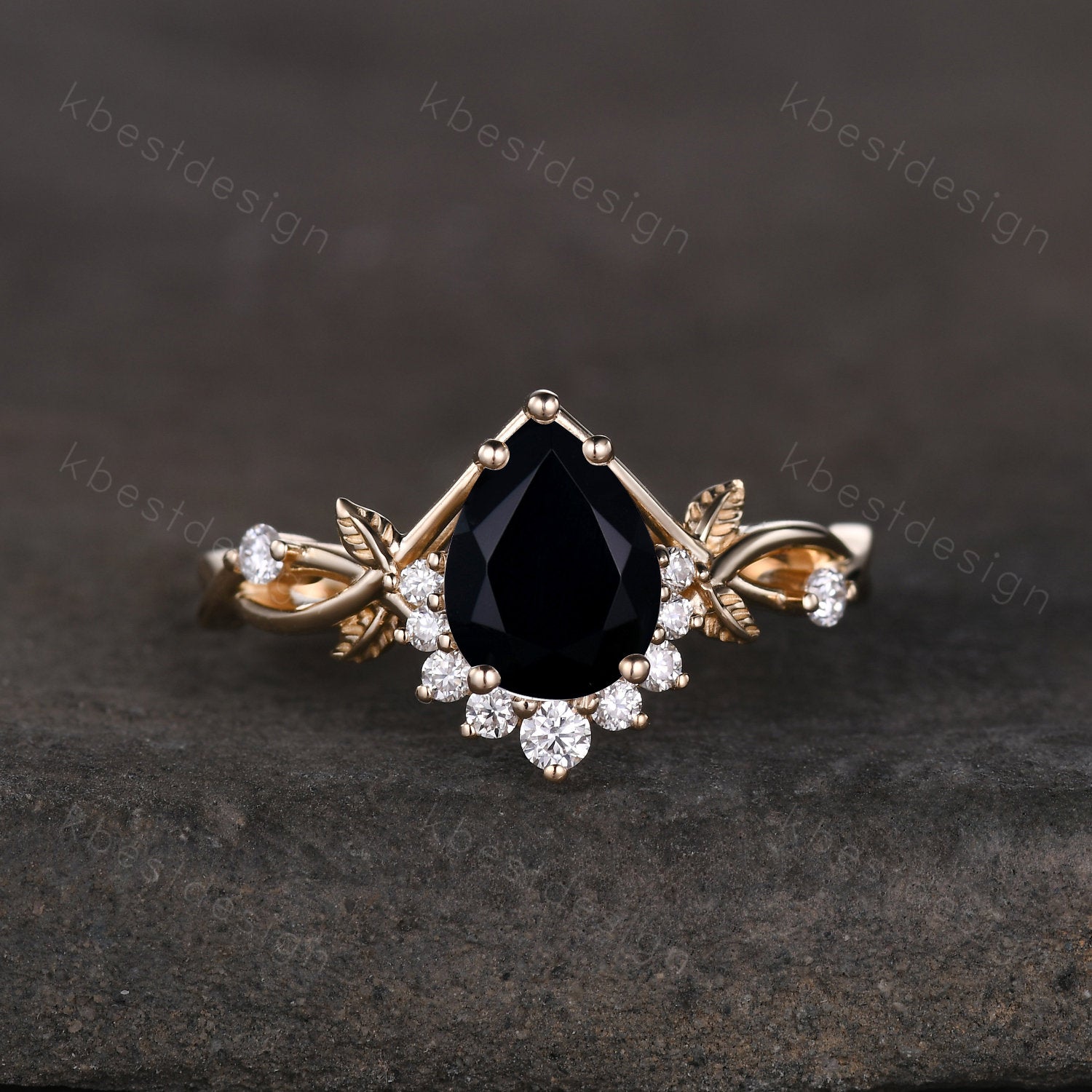 Vintage pear black onyx engagement ring yellow gold twig leaf wedding ring nature branch ring art deco moissanite bridal promise ring.
