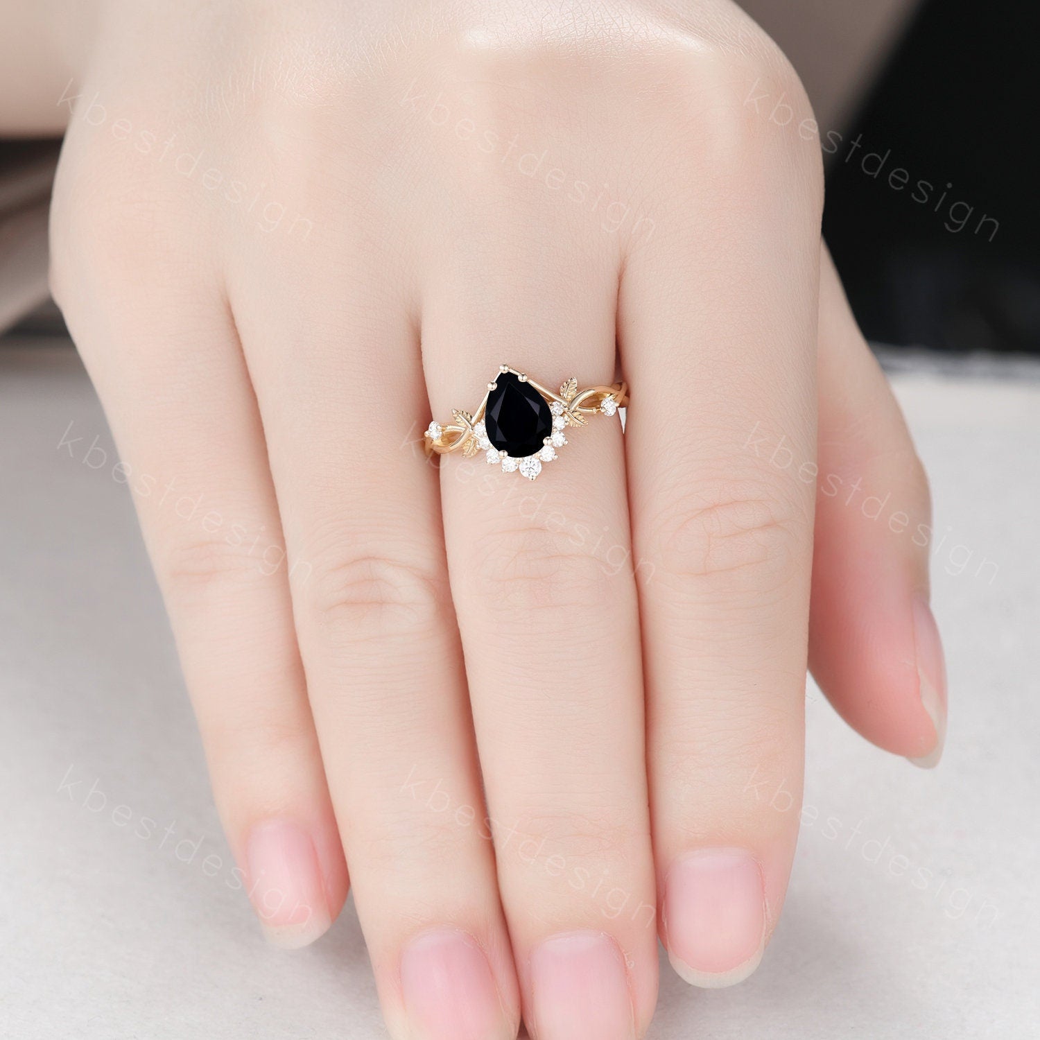 Vintage pear black onyx engagement ring yellow gold twig leaf wedding ring nature branch ring art deco moissanite bridal promise ring