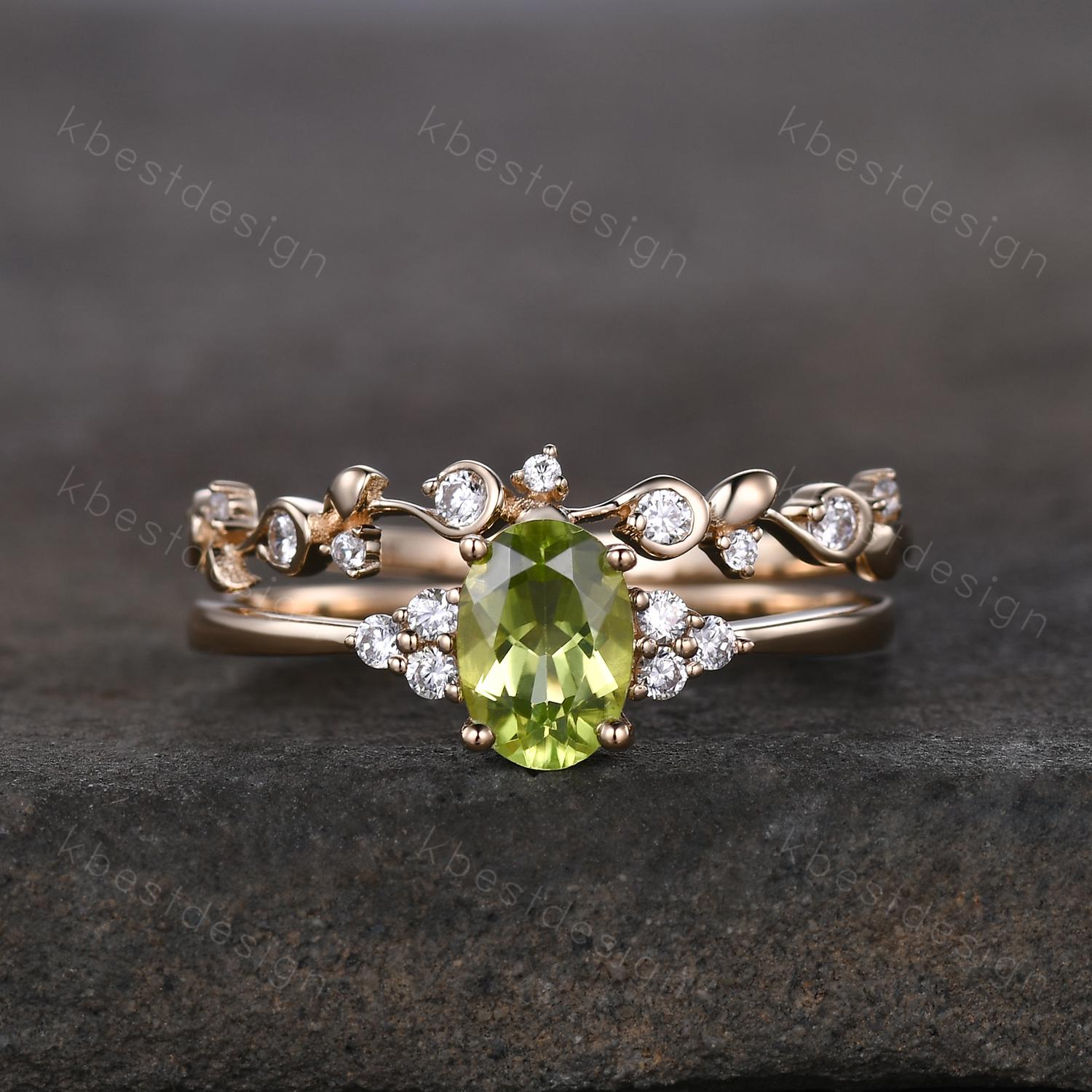 This is a beautiful natural peridot engagement ring set in rose gold. Vintage Peridot Engagement Ring Set Oval Green Peridot Ring 14K Gold Art Deco Moissanite Stacking Band August Birthstone Ring Promise Ring