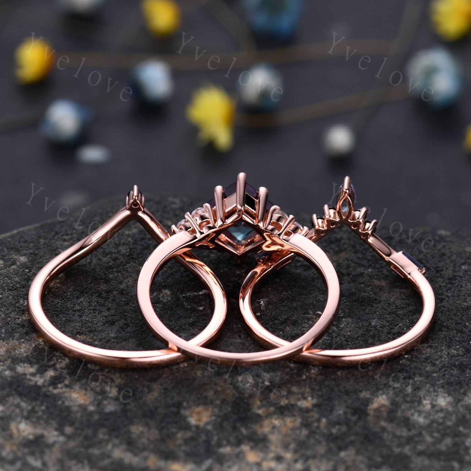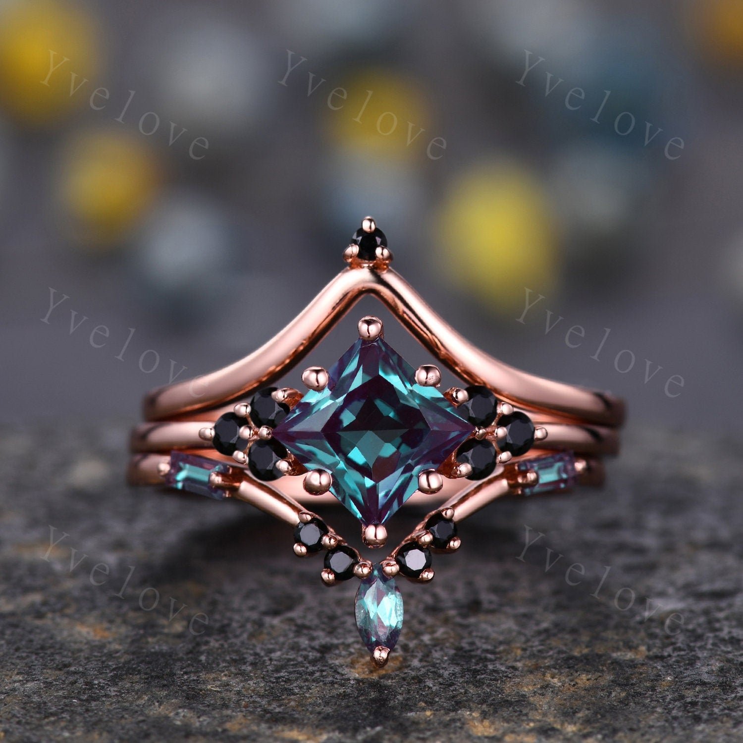Vintage princess cut alexandrite engagement ring set,black spinel ring,baguette alexandrite,sterling silver ring set,unique ring set gift,3pcs ring set,color changing ring