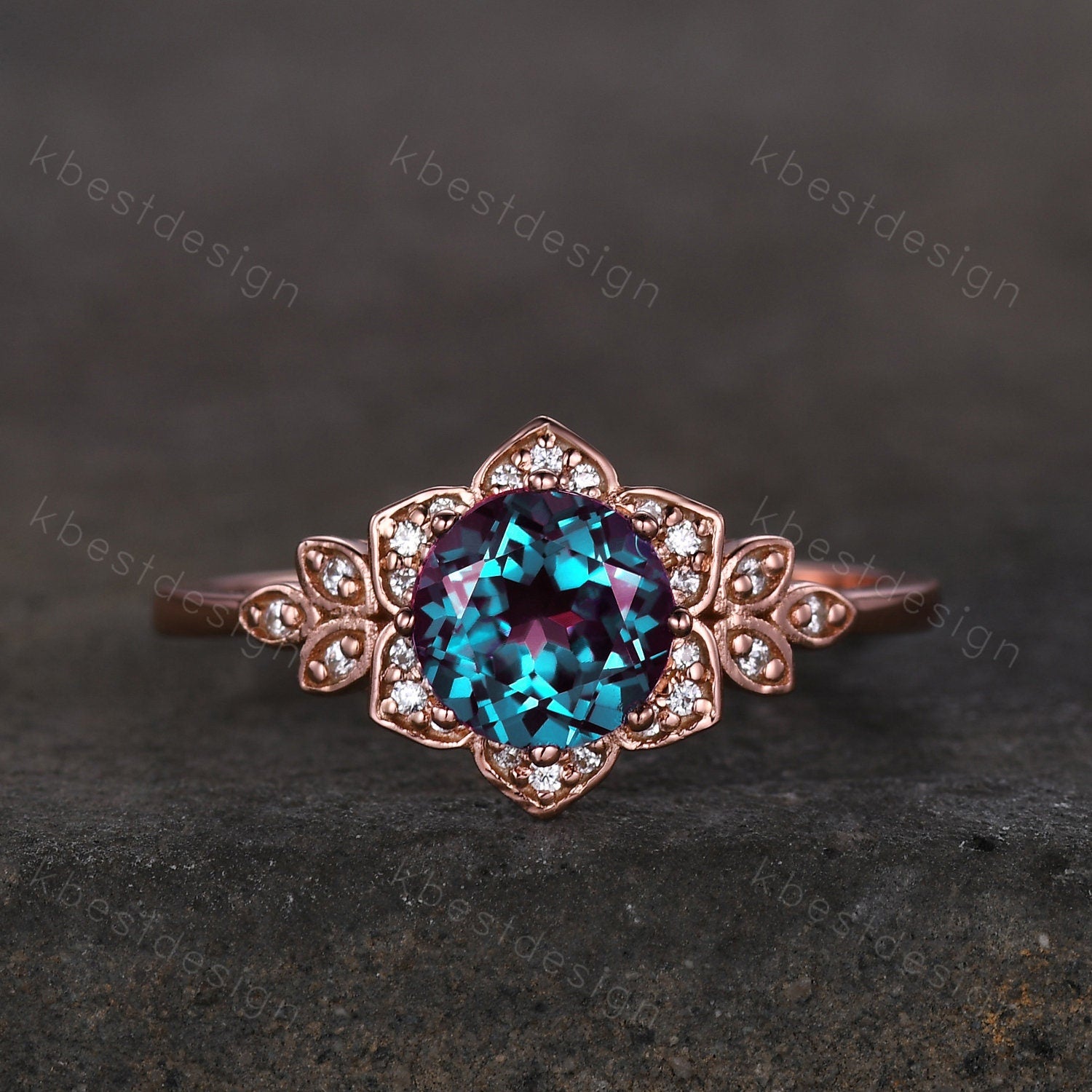 This is a green purple (color changing) alexandrite set with Moissanite halo ring in rose gold. A Modern round cut meets an solitaire minimalist design in this unique color changing stone engagement ring.