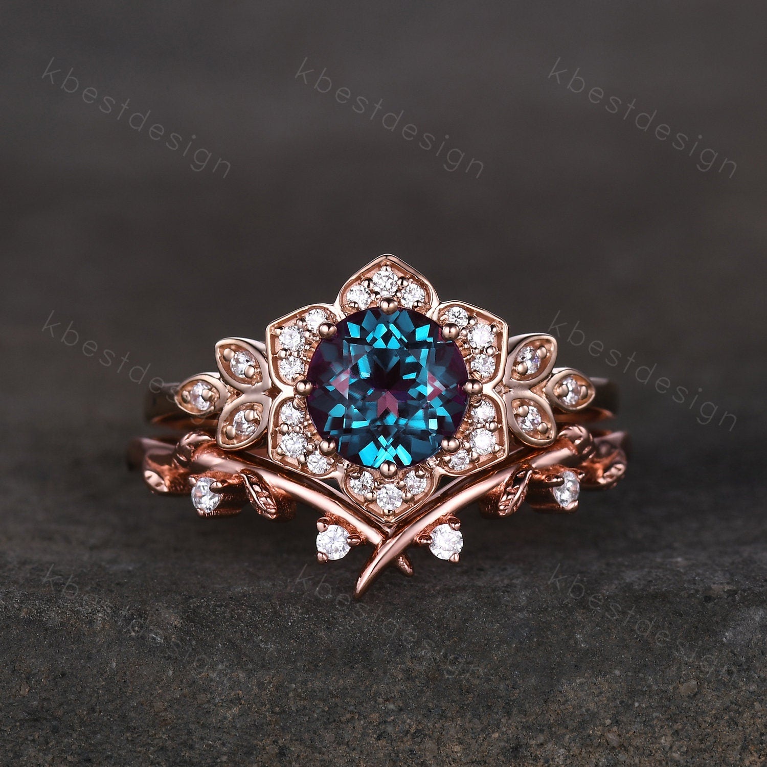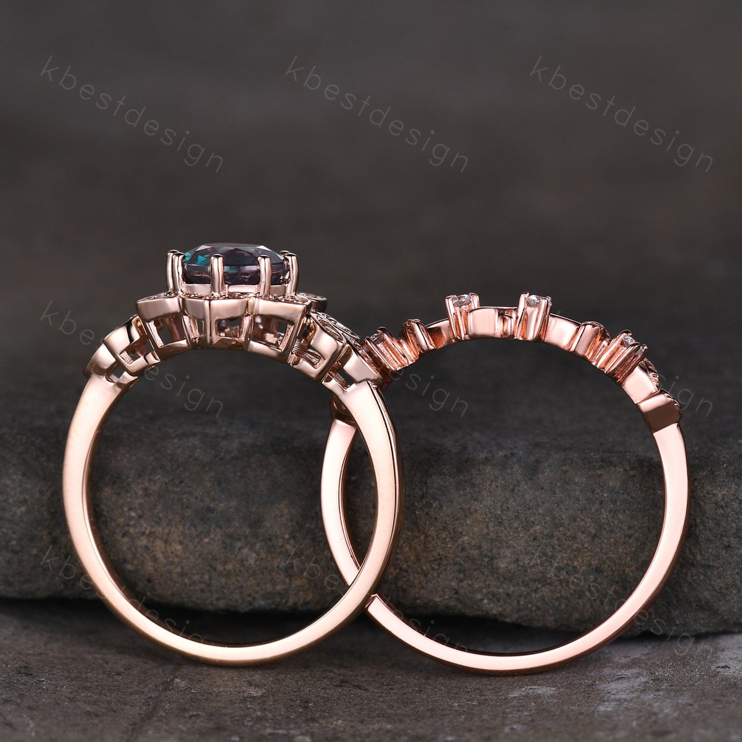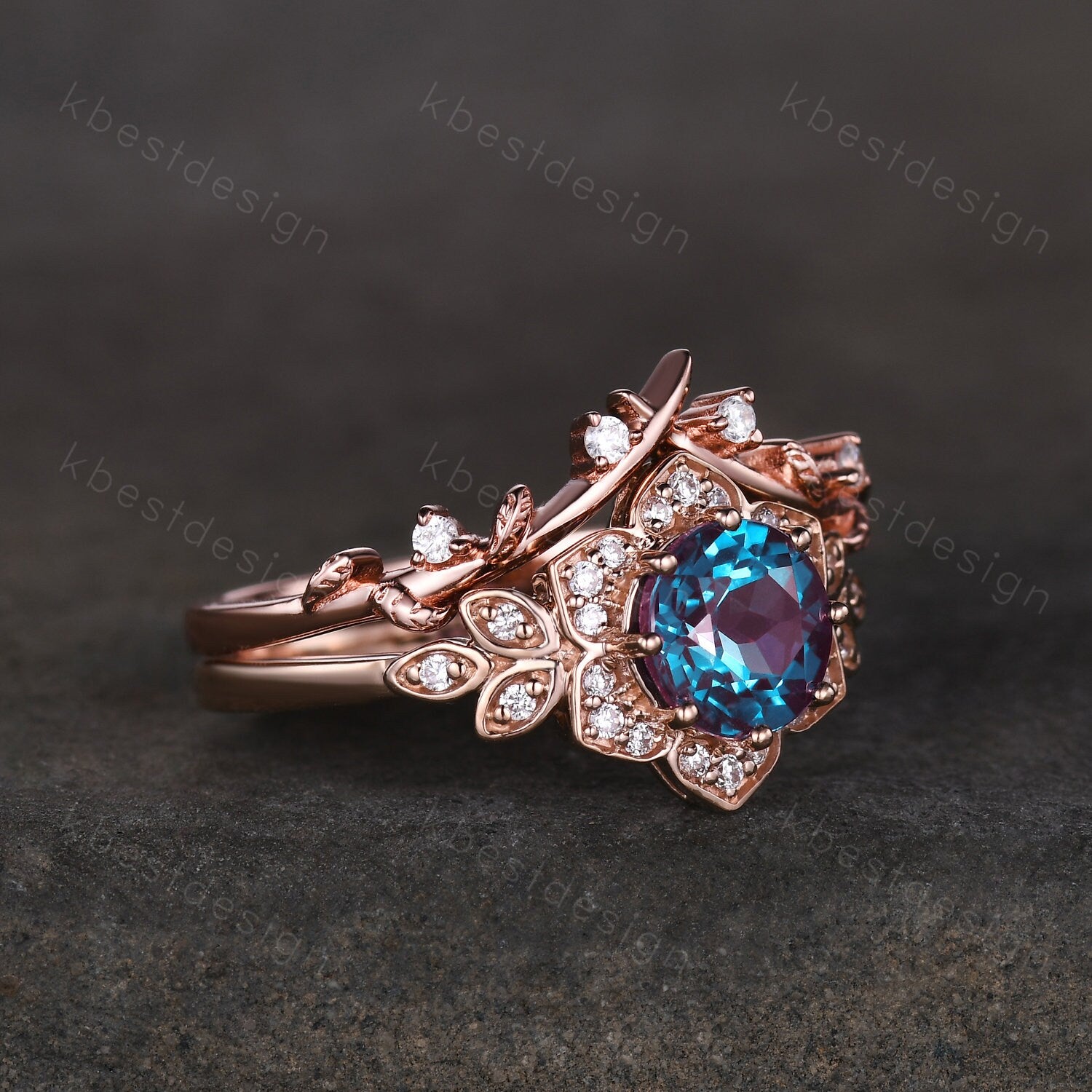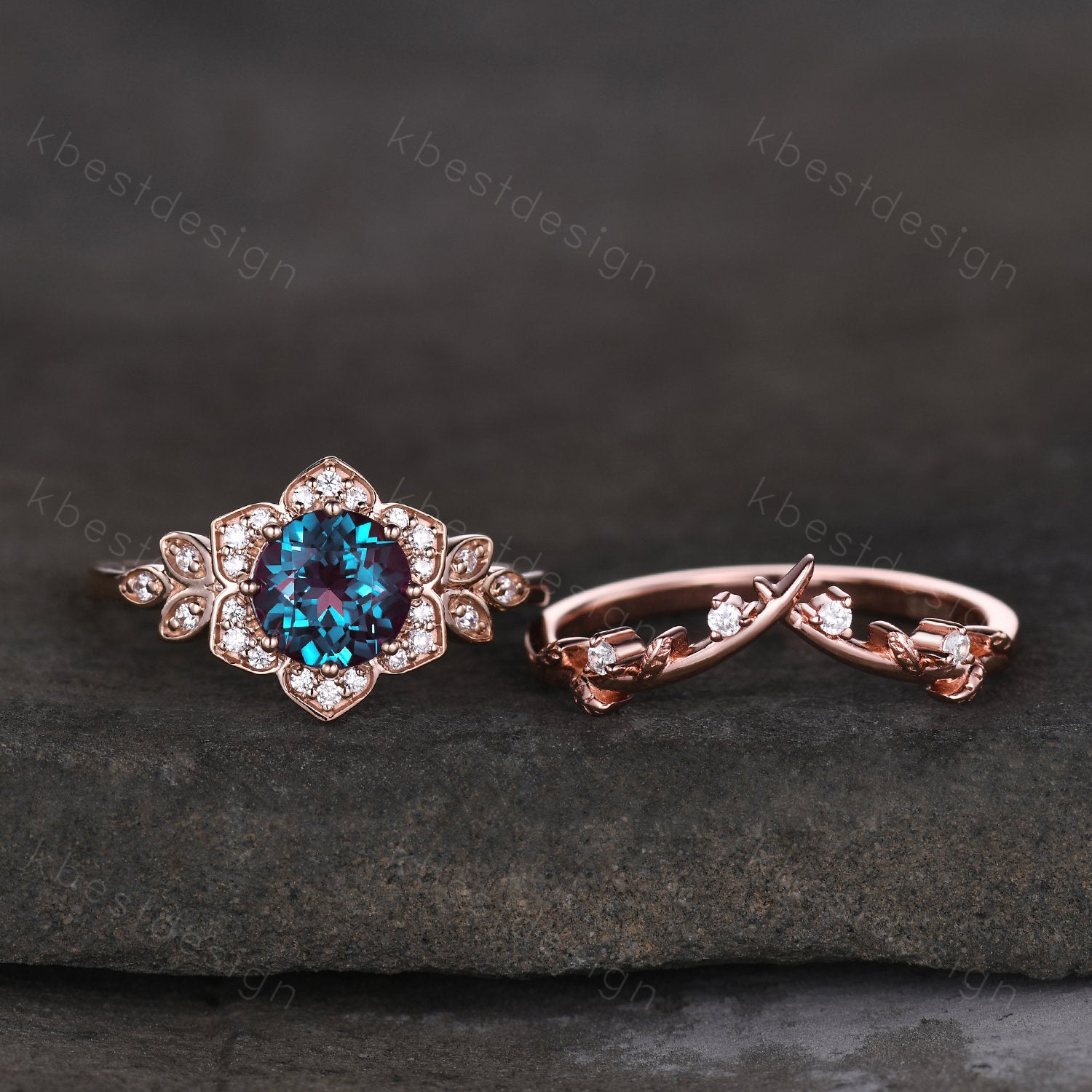 Vintage round Alexandrite engagement ring set antique moissanite halo ring rose gold twig wedding ring June Birthstone ring Promise ring set