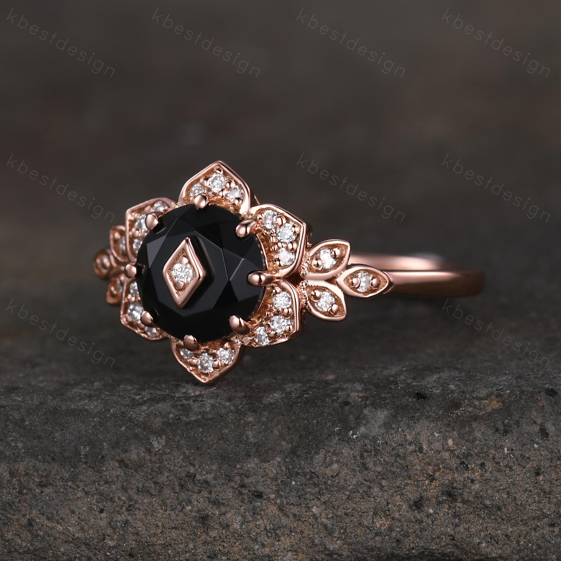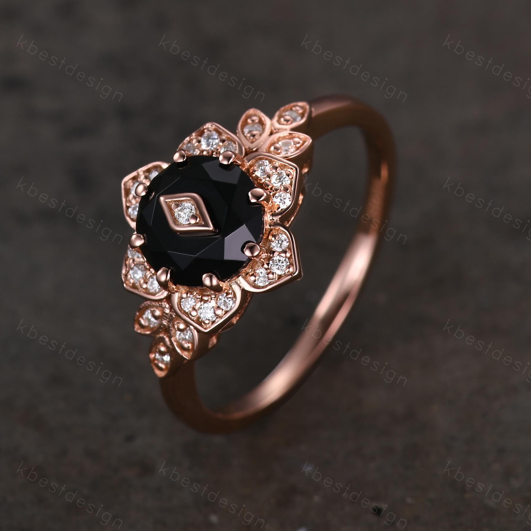 Vintage round Black Onyx engagement ring antique moissanite halo ring rose gold floral petal ring Nature inspired ring Promise ring