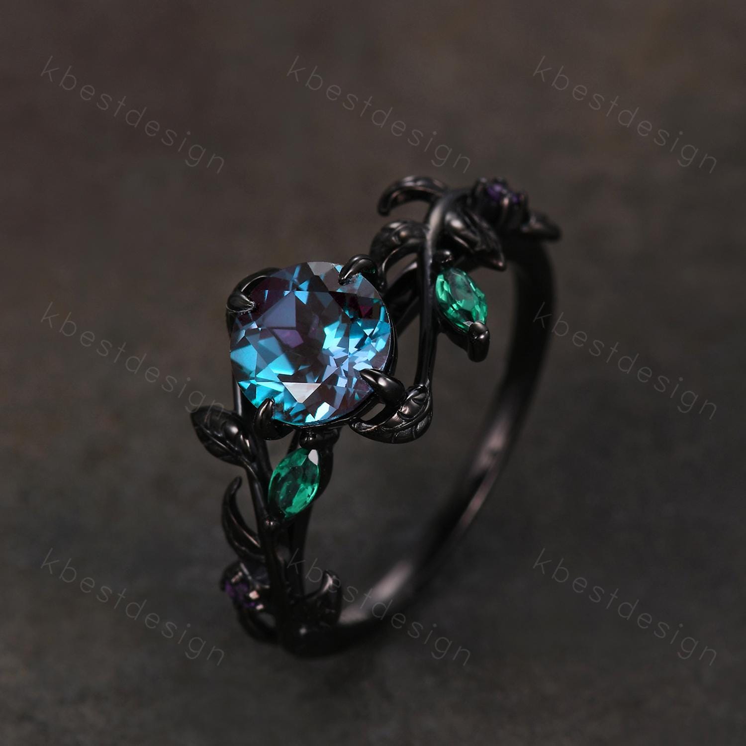 Vintage round cut alexandrite engagement ring gothic black gold art deco emerald leaf ring nature inspired bridal promise ring for her
