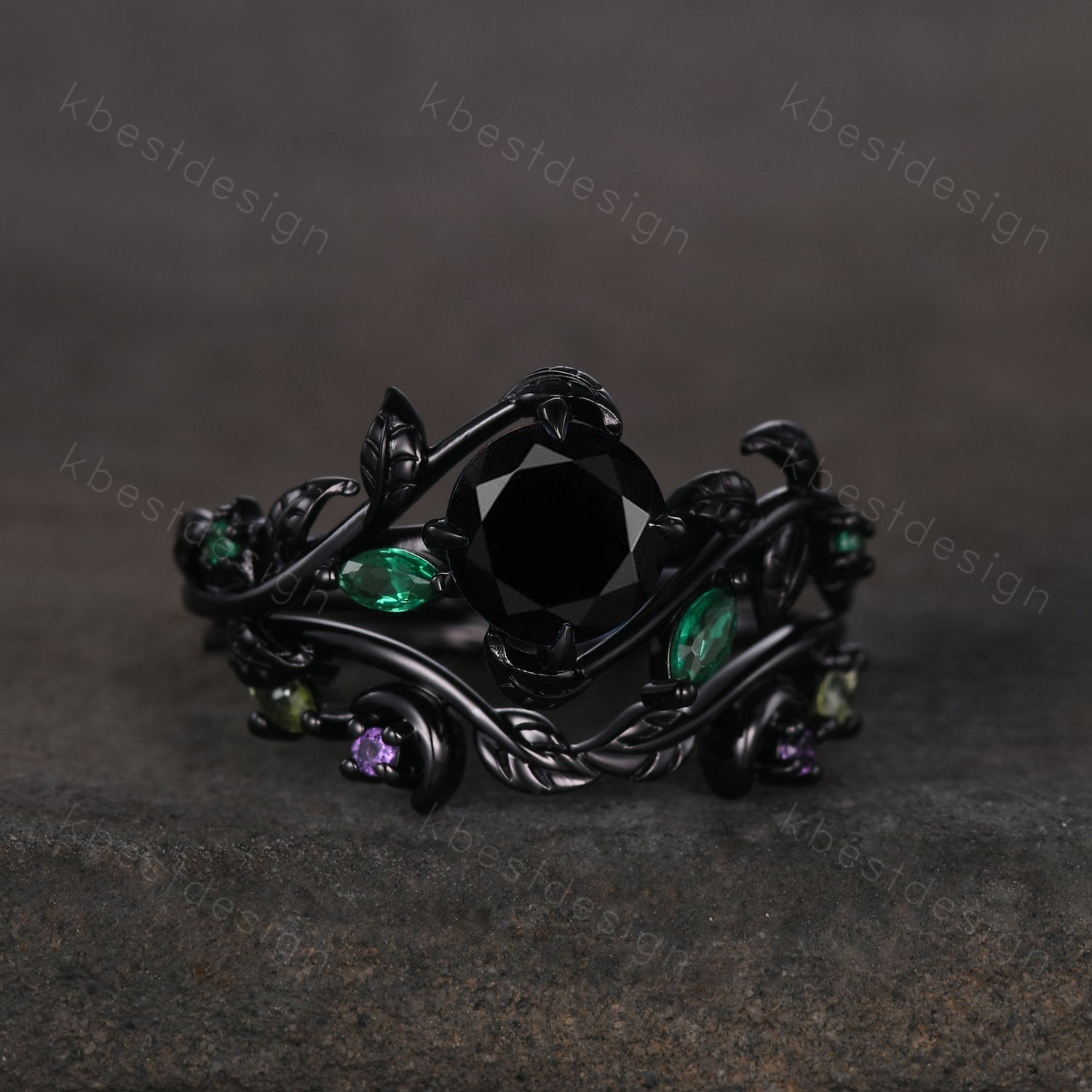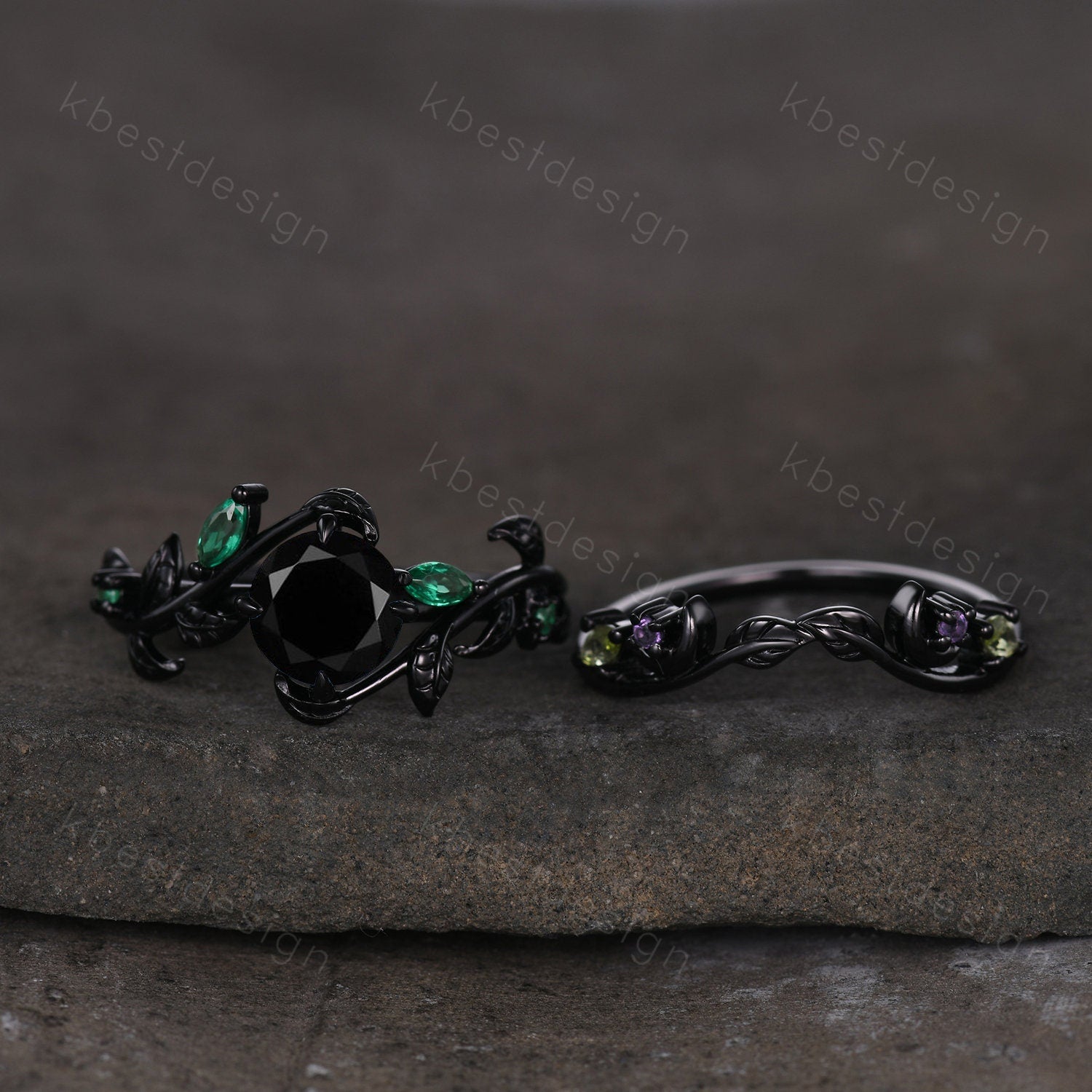 Vintage round cut black onyx engagement ring black gold emerald cluster leaf wedding ring set nature inspired bridal promise ring for her
