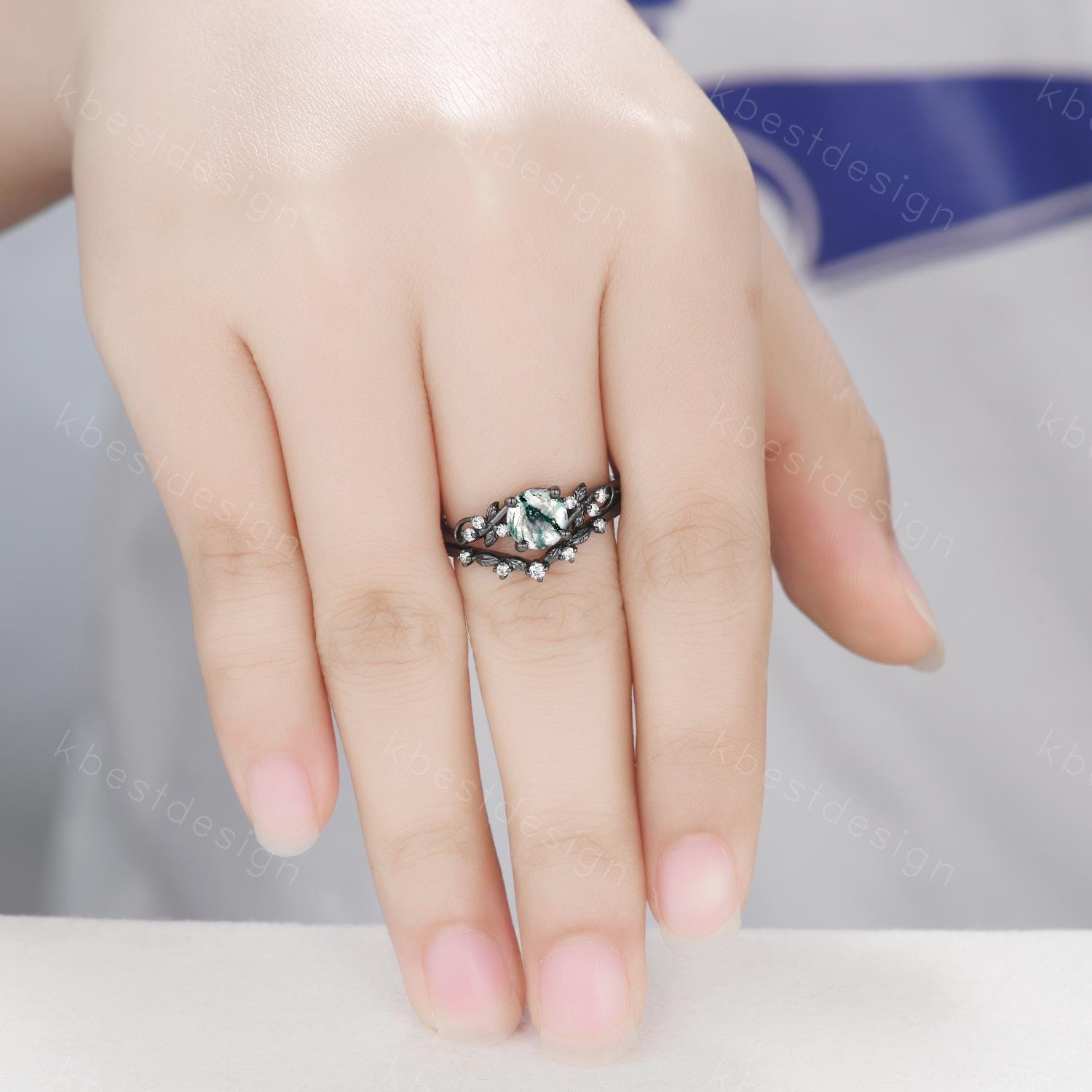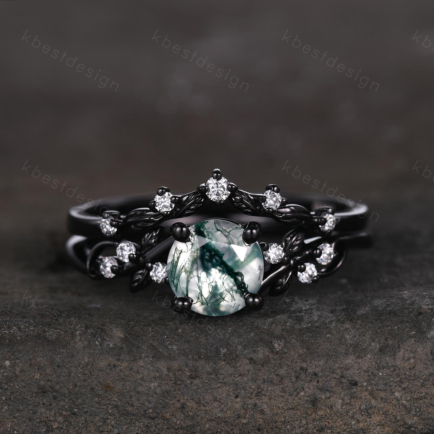Vintage round cut moss agate engagement ring set black gold twig leaf moissanite ring nature branch ring unique art deco bridal wedding ring set