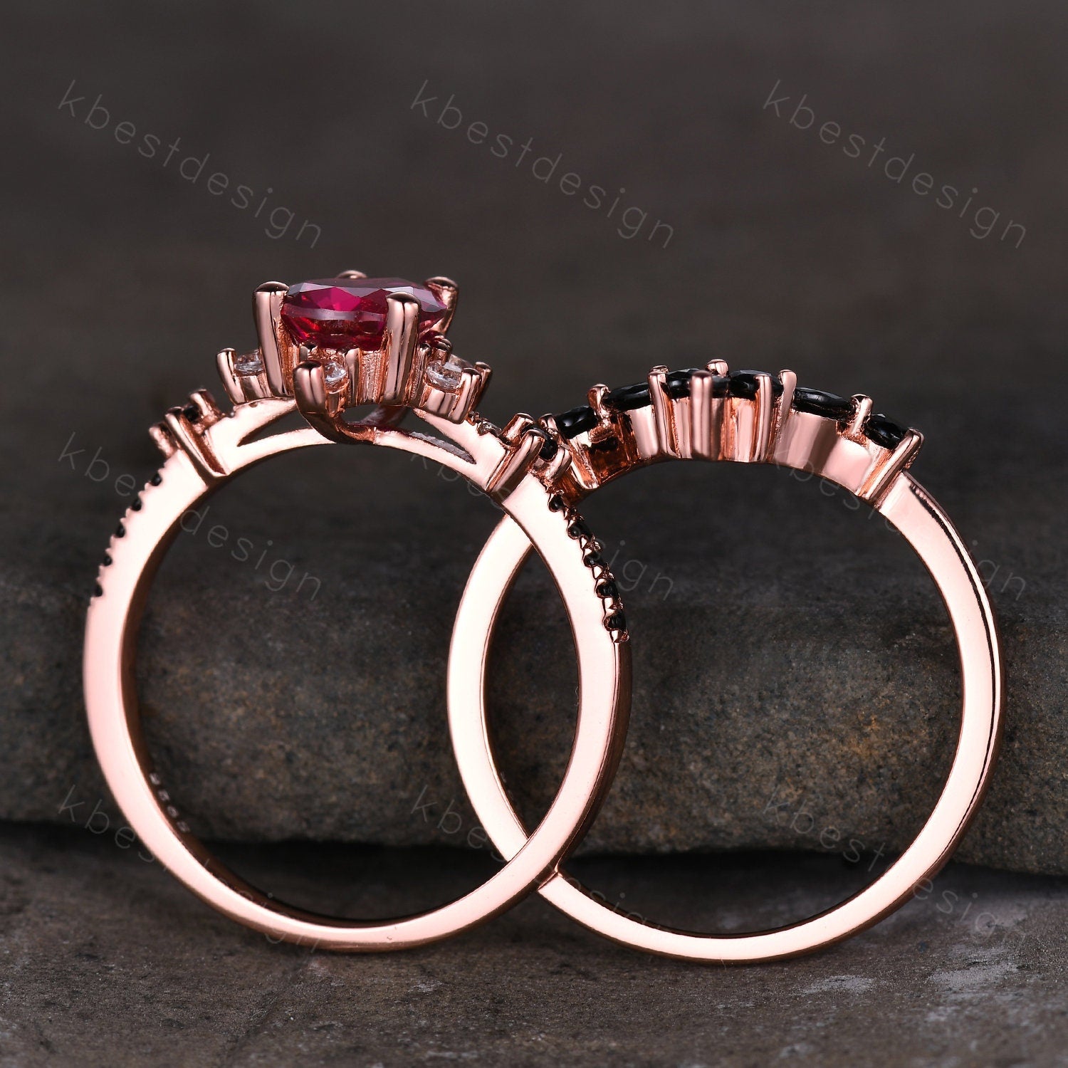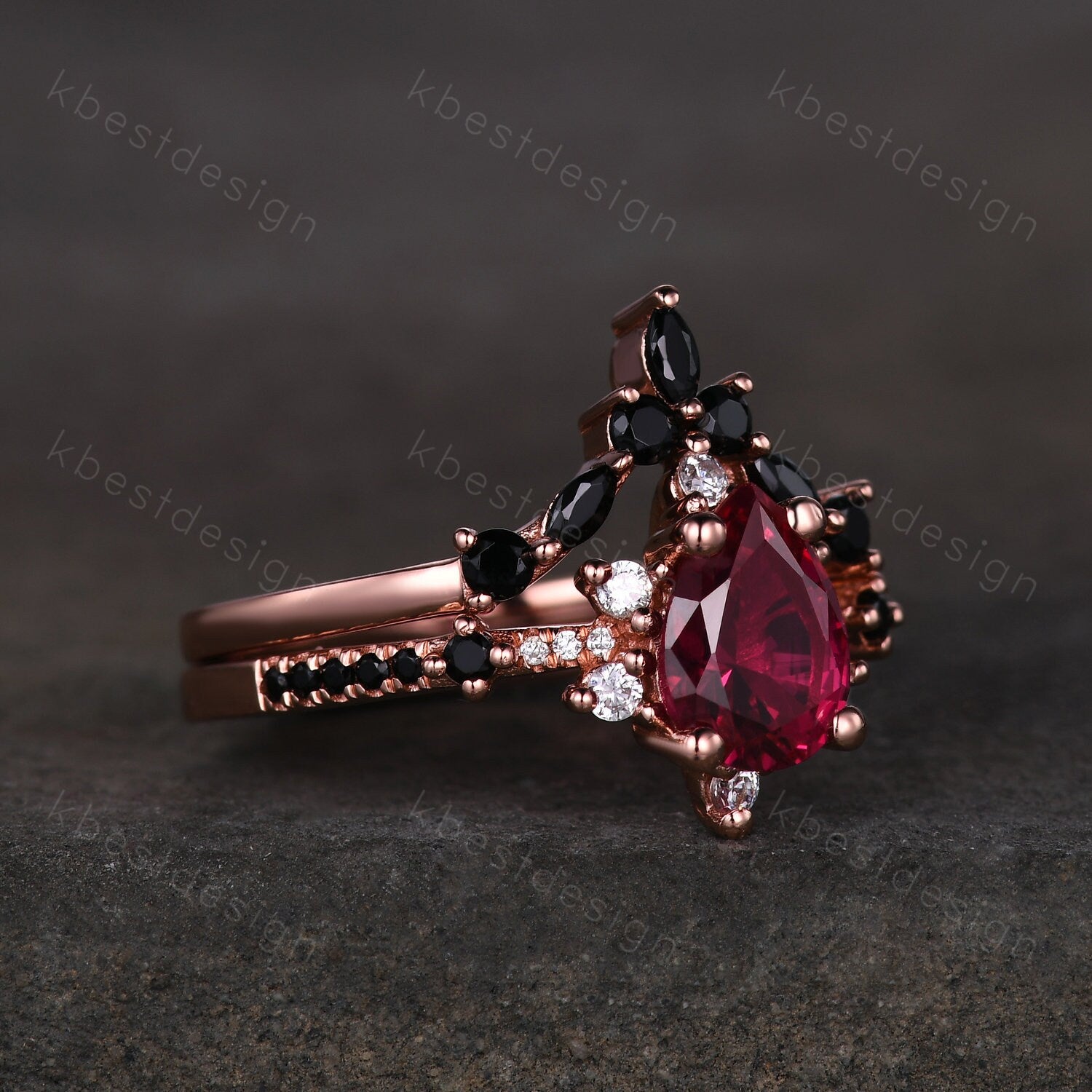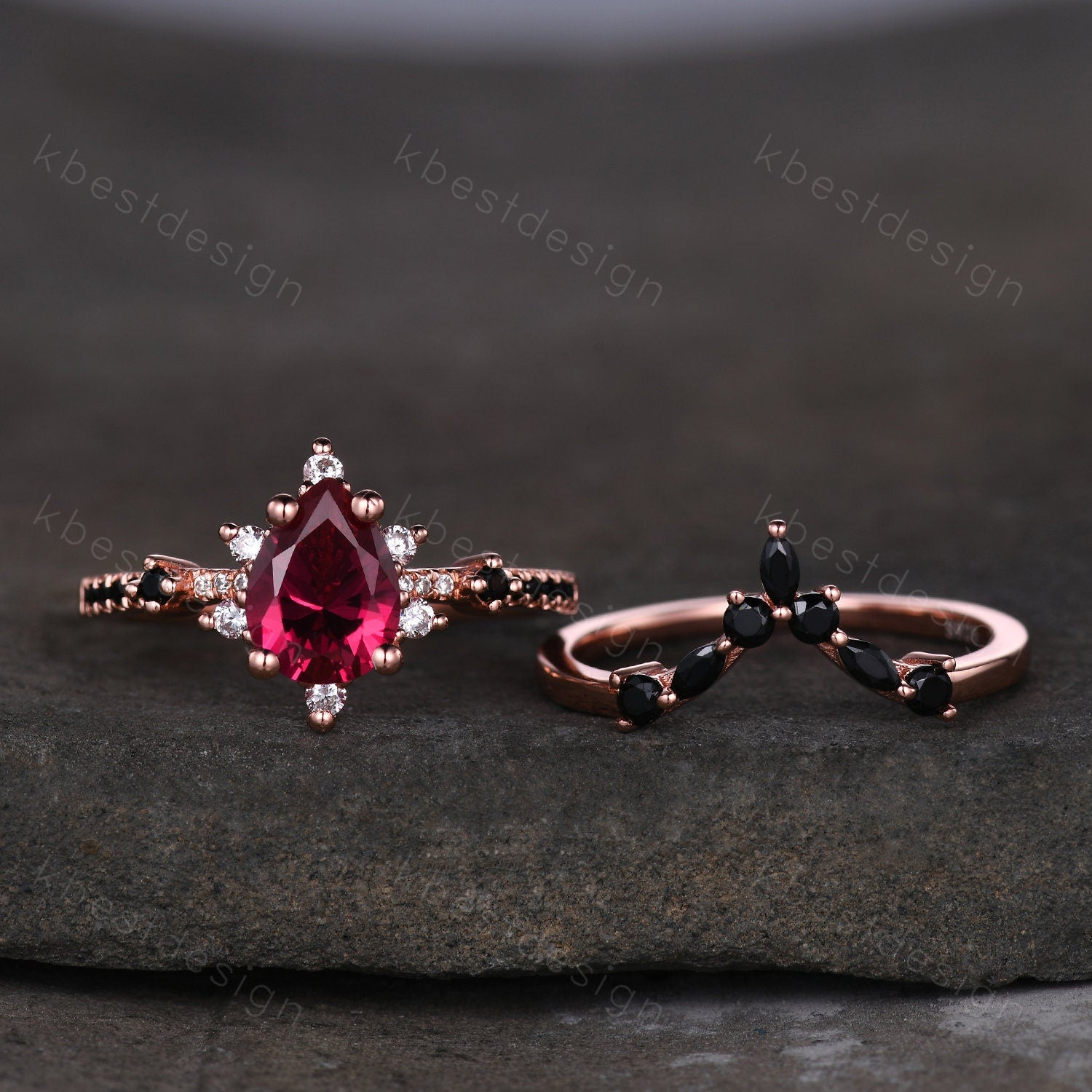 Vintage ruby engagement ring rose gold ring art deco curved black spinel wedding band pear cut bridal set unique anniversary wedding set