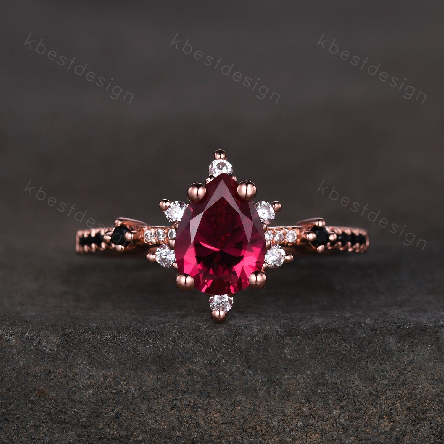 Main Stone: 6x8mm pear cut lab created ruby.
