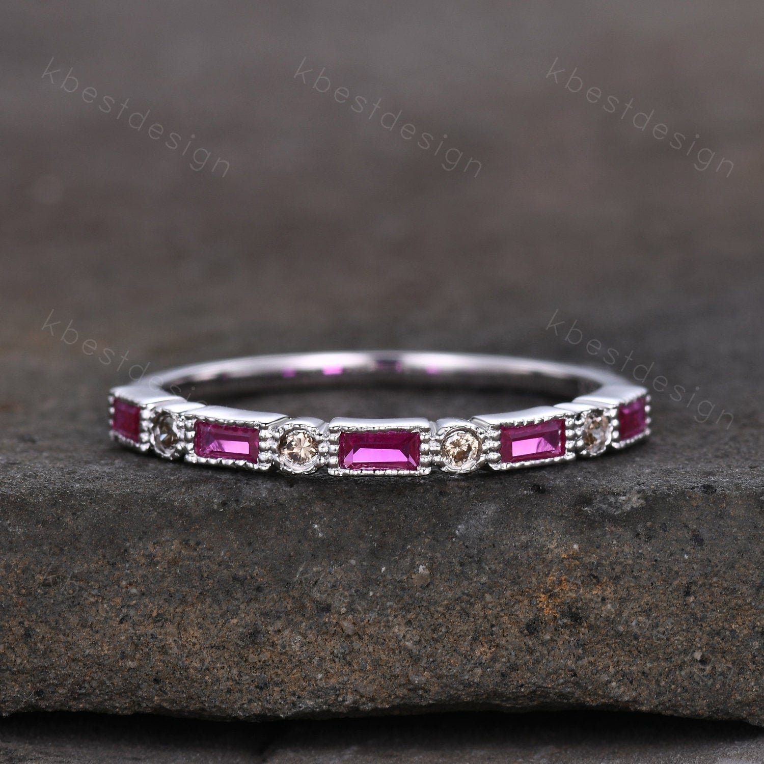 Vintage Ruby Wedding Band Women White Gold Wedding Band Salt and Pepper Diamond Ring Art Deco Stacking Band Anniversary Gift for Her