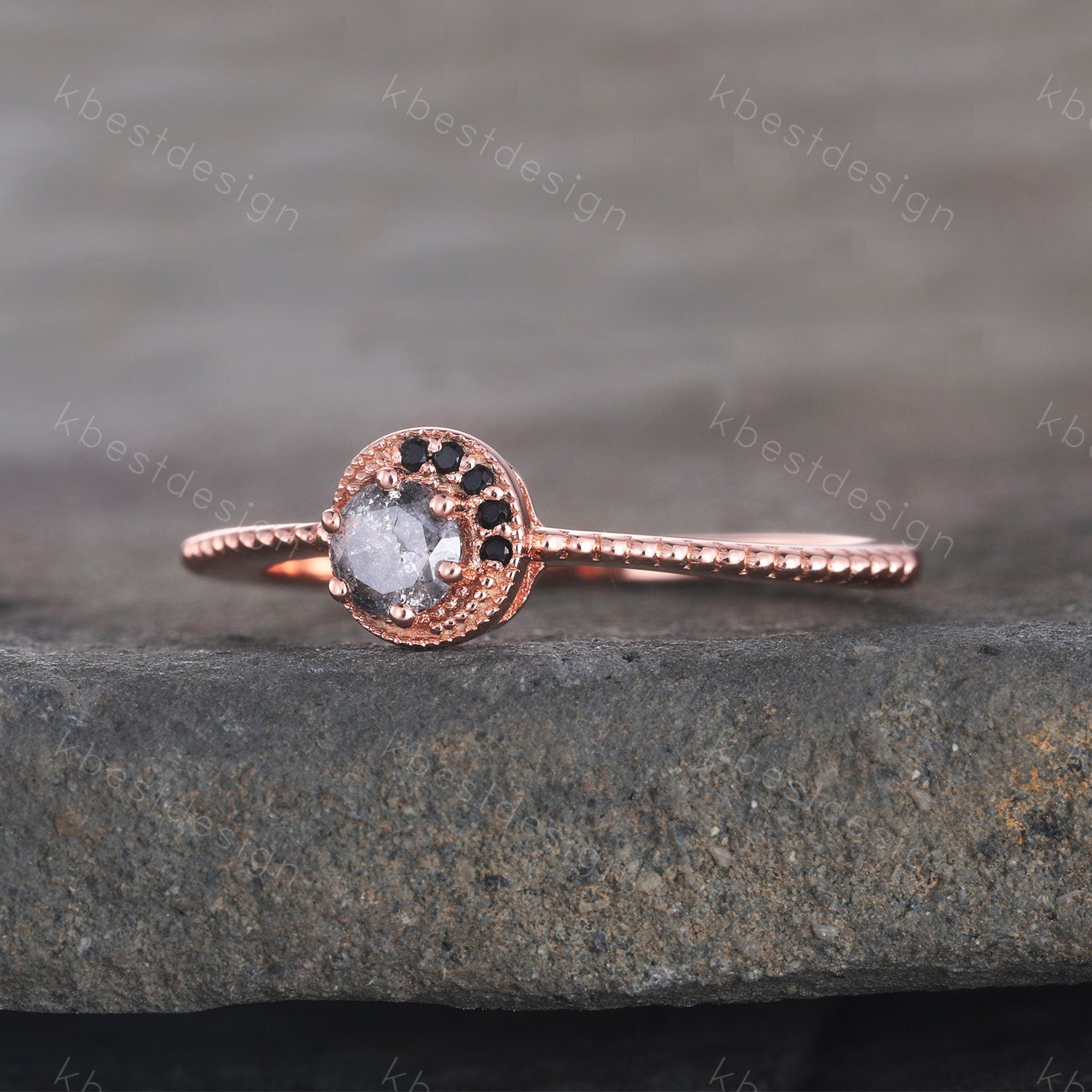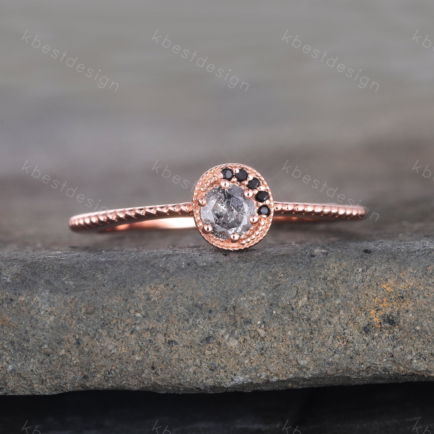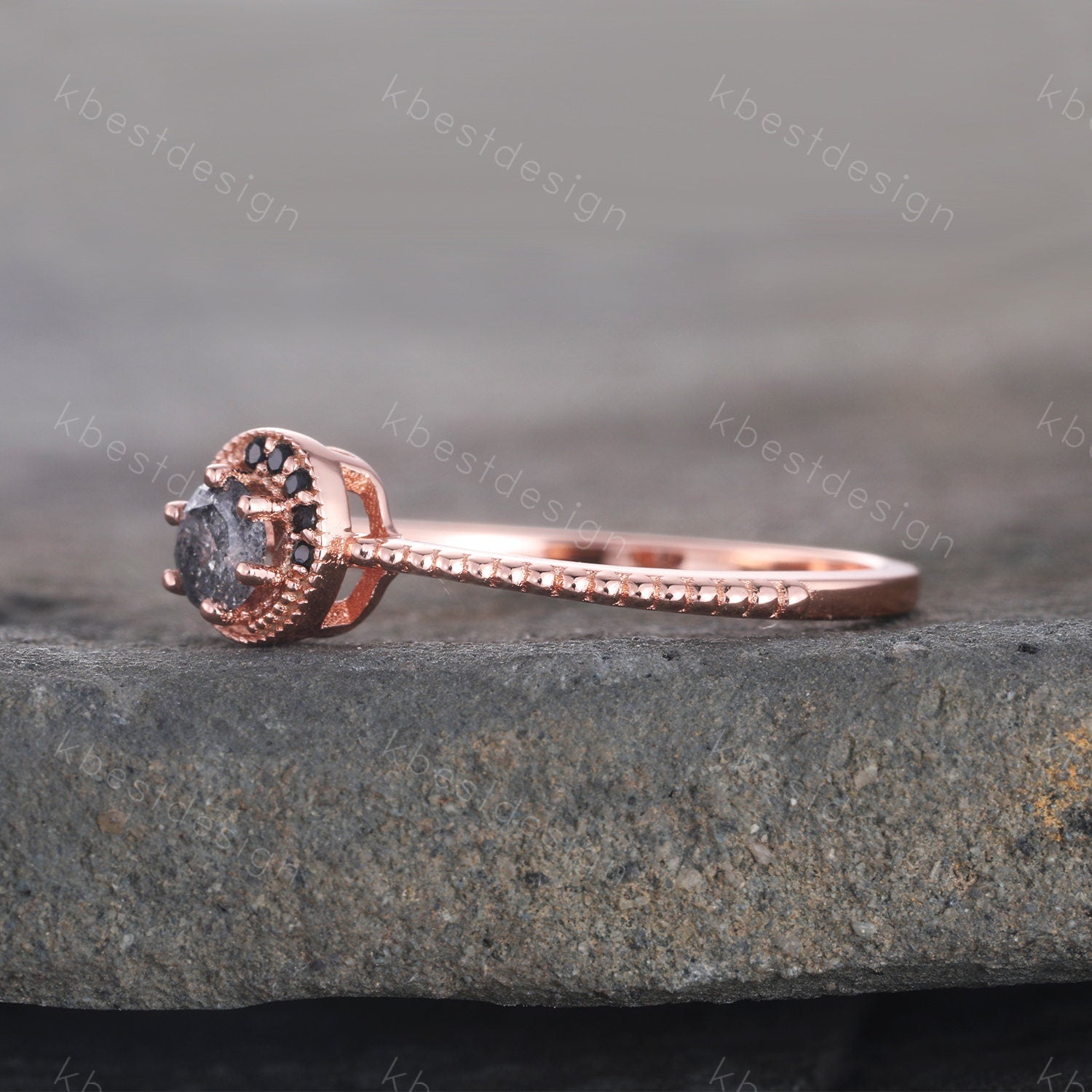 Vintage Salt and Pepper Diamond Engagement Ring Black Diamond Ring Unique Wedding Ring Rose Gold Ring Round Shaped Bridal Ring Promise Ring