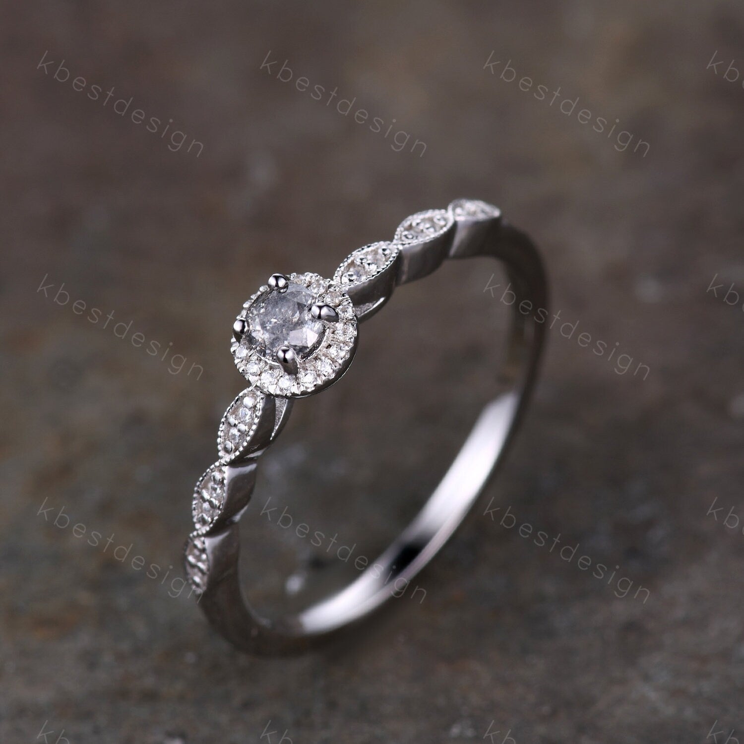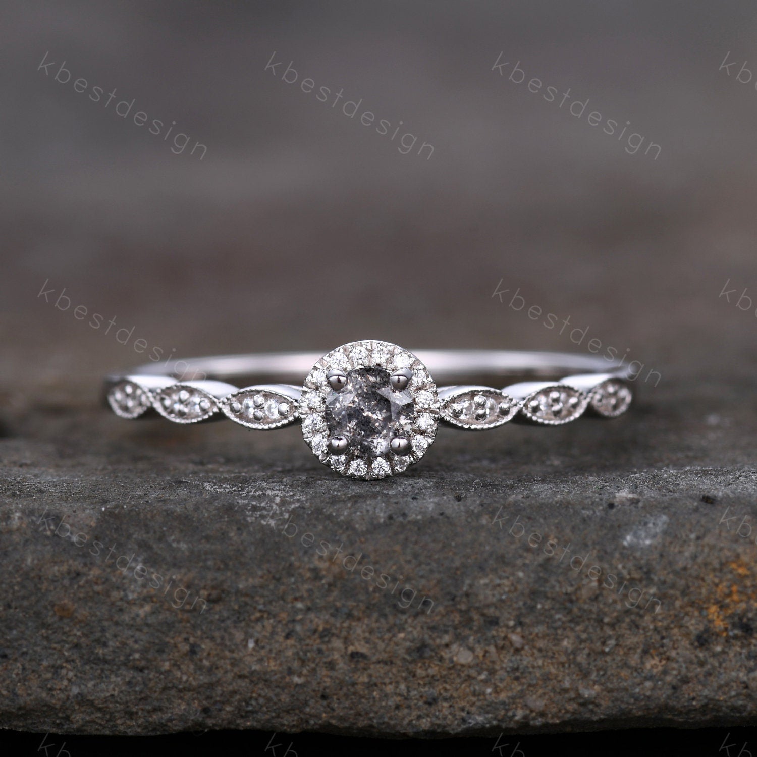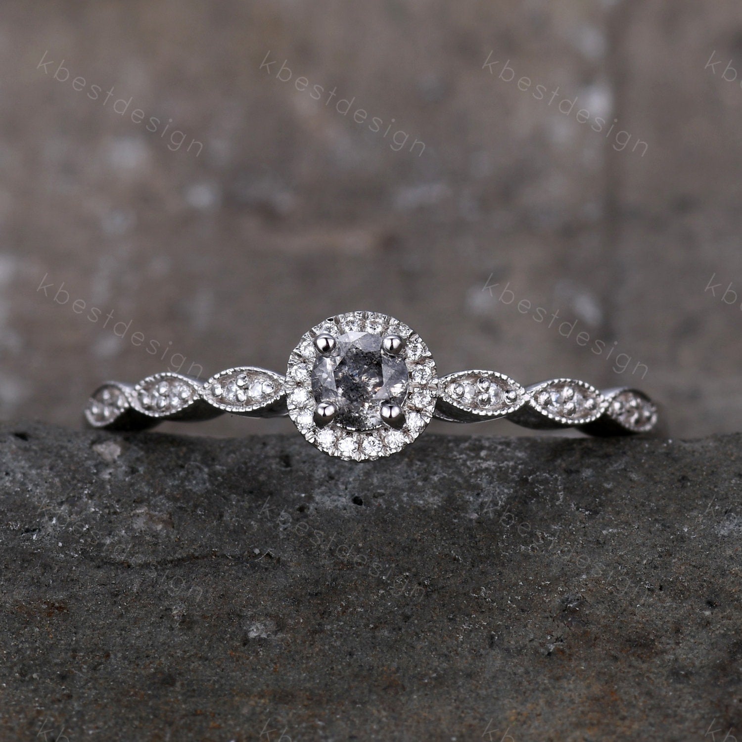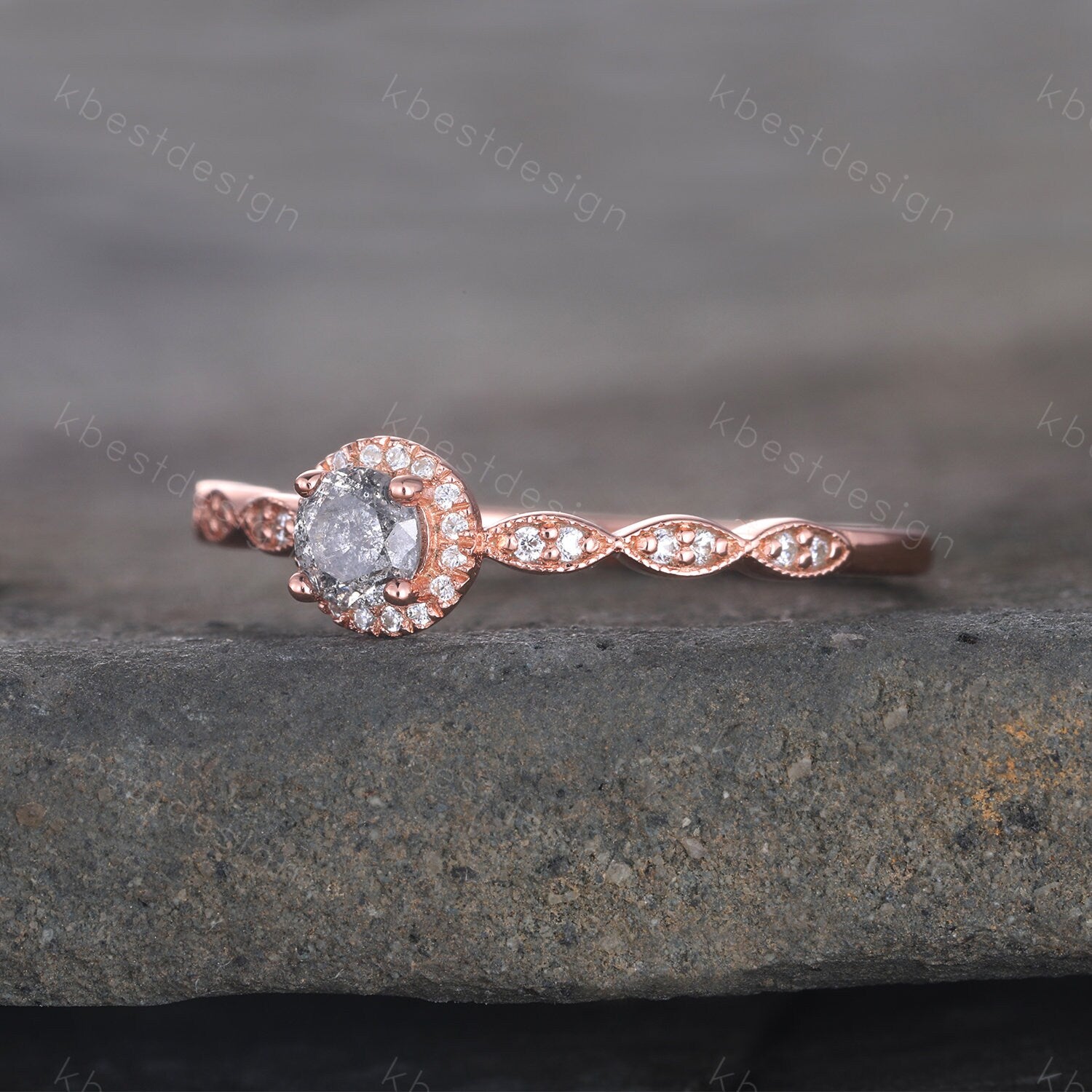 Vintage Salt and Pepper Diamond Engagement Ring Rose Gold Ring Dainty Halo Wedding Ring Art deco Wedding Ring Bridal Anniversary Ring