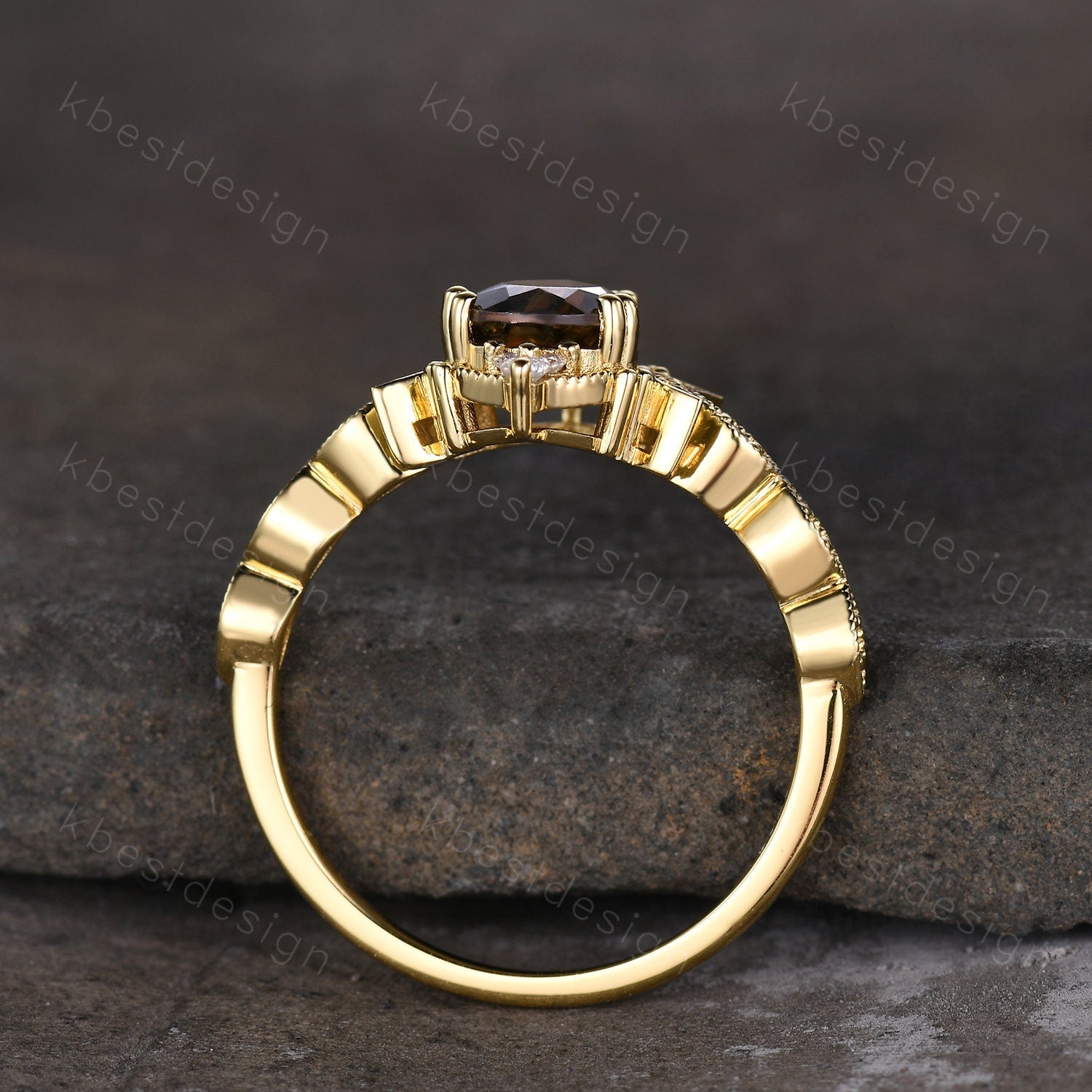This is a Vintage Smoky Quartz Engagement Ring Yellow Gold Pear cut Brown Quartz Ring Unique Moon Goddess Ring Art Deco Moissanite Bridal Promise Ring