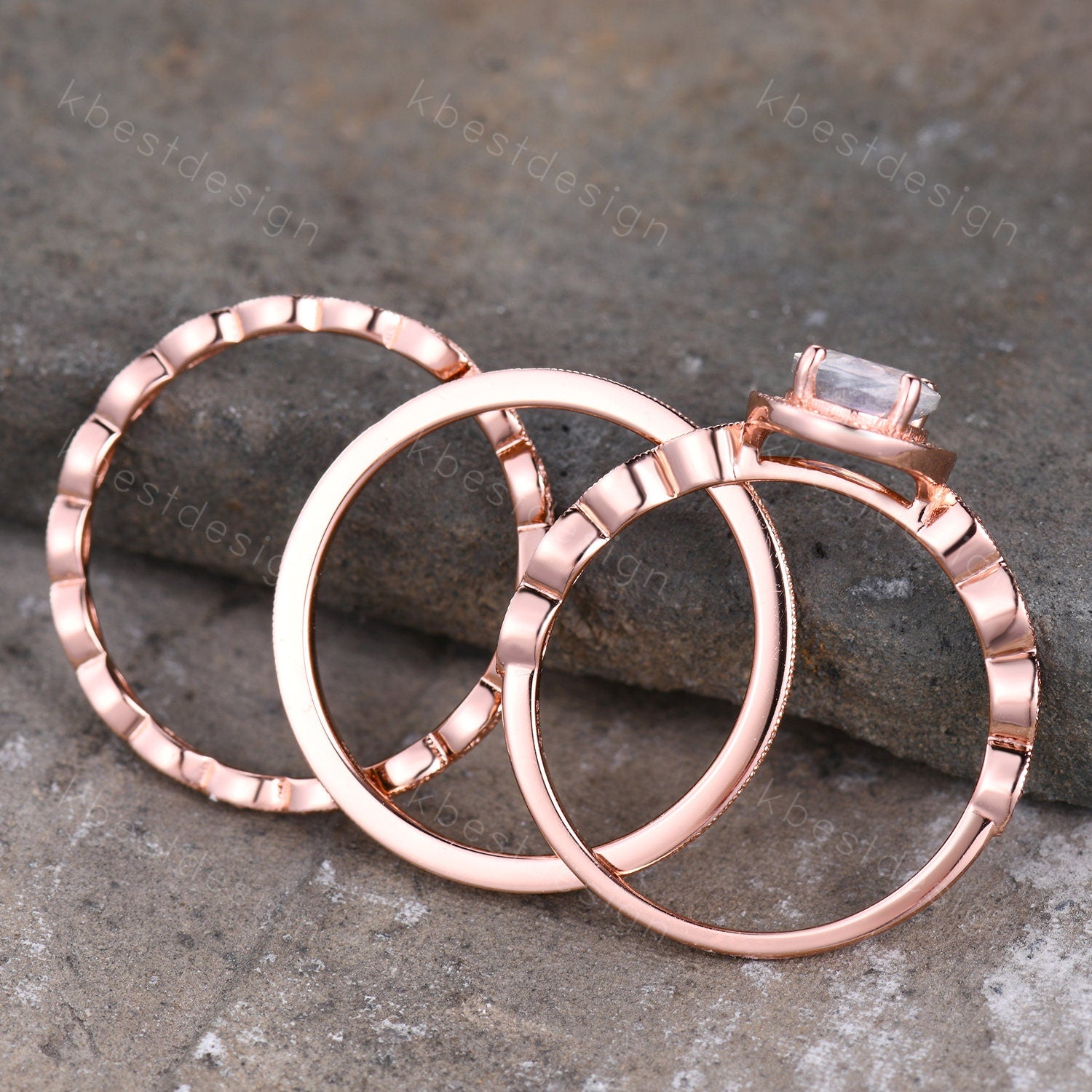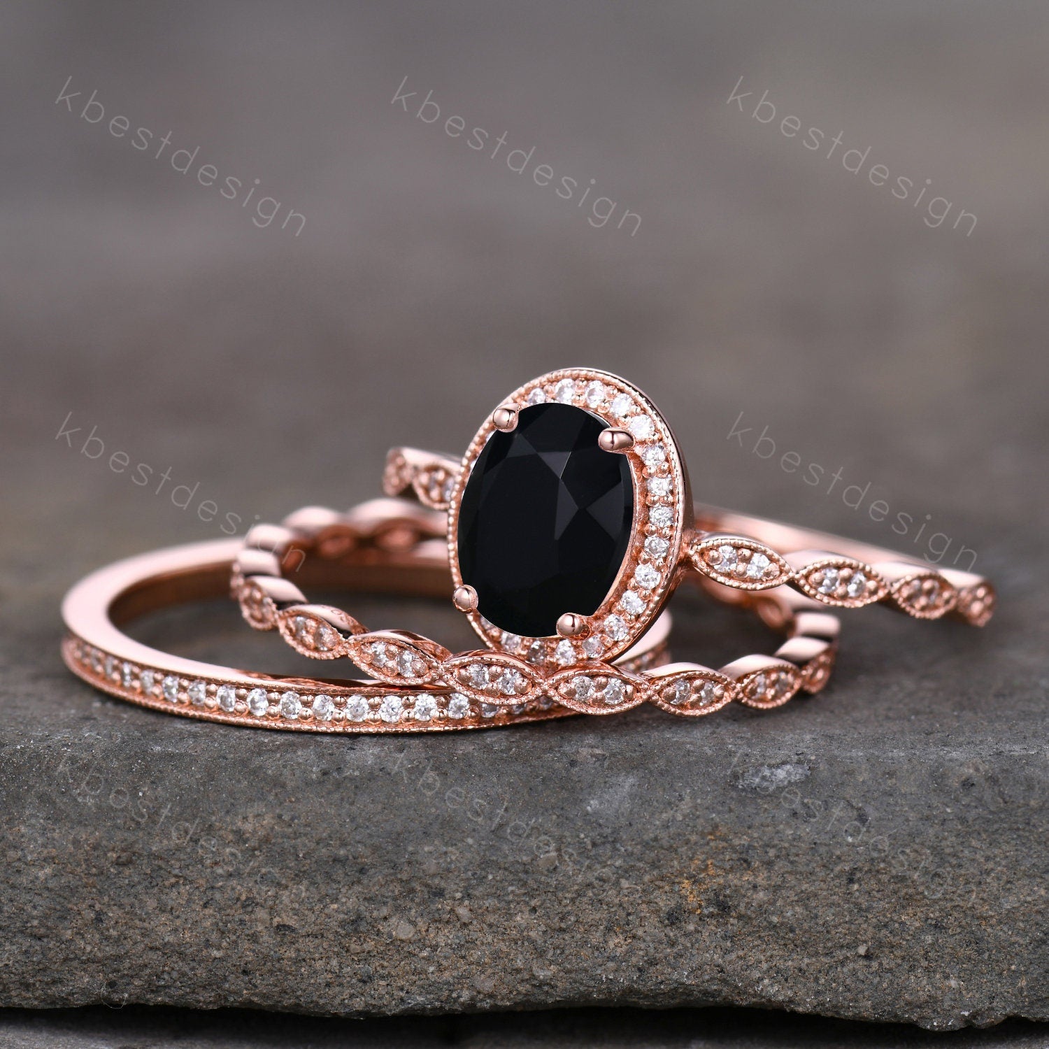 Vintage Unique oval cut Black Onyx engagement ring set rose gold ring set moissanite ring set art deco bridal wedding ring Promise gift