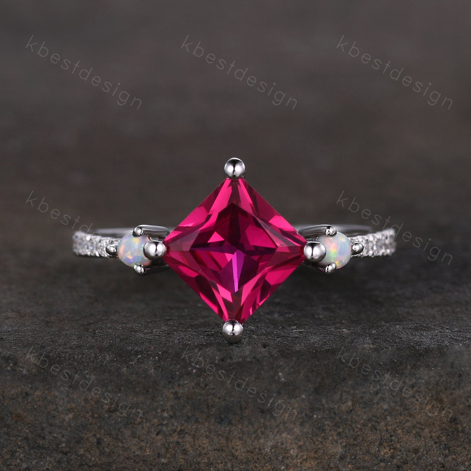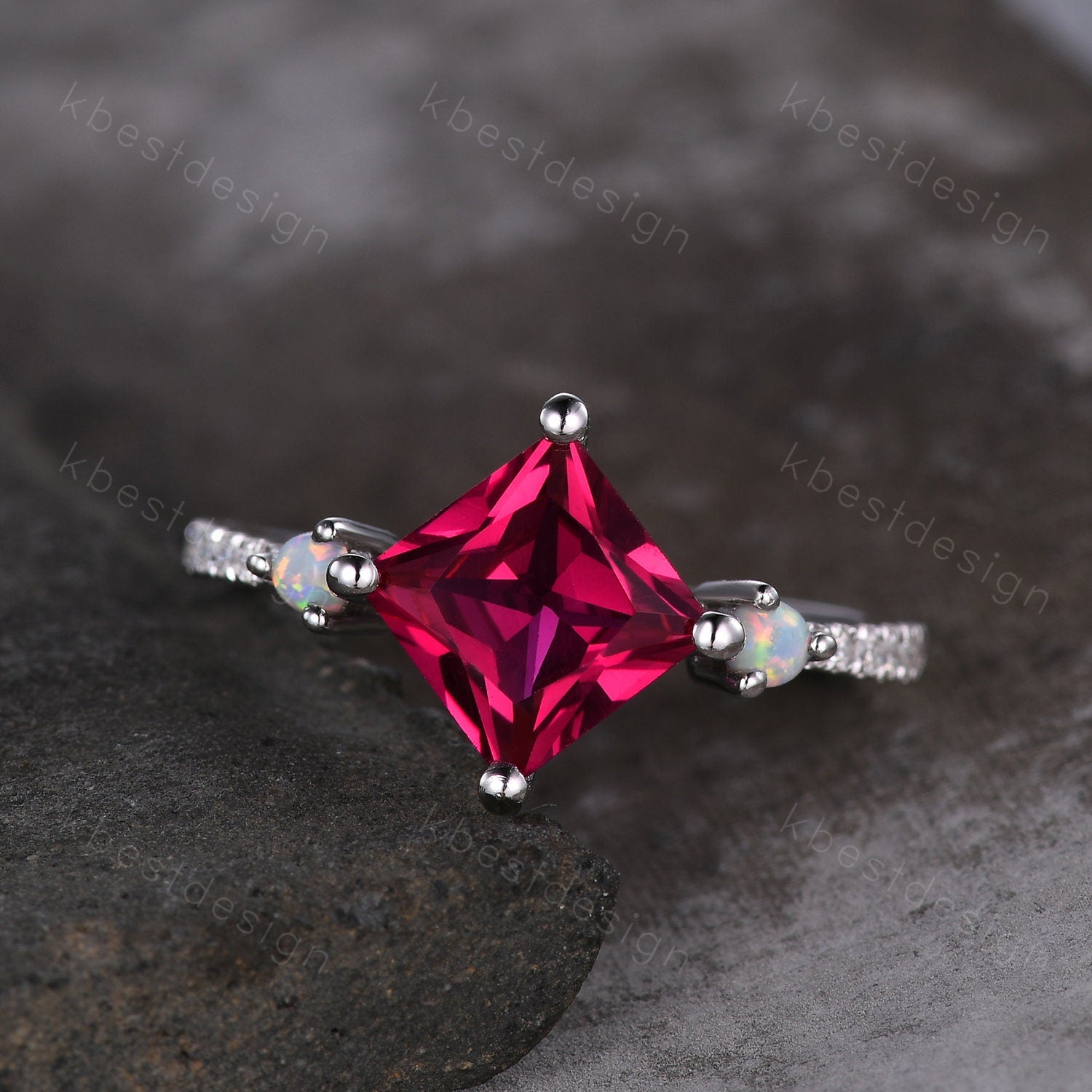 This is a 3pcs Vintage Unique princess cut Ruby engagement ring set sterling silver ring set curved opal moissanite stacking bands art deco wedding rings. Unique princess cut ring, wedding ring, promise ring, anniversary gift.