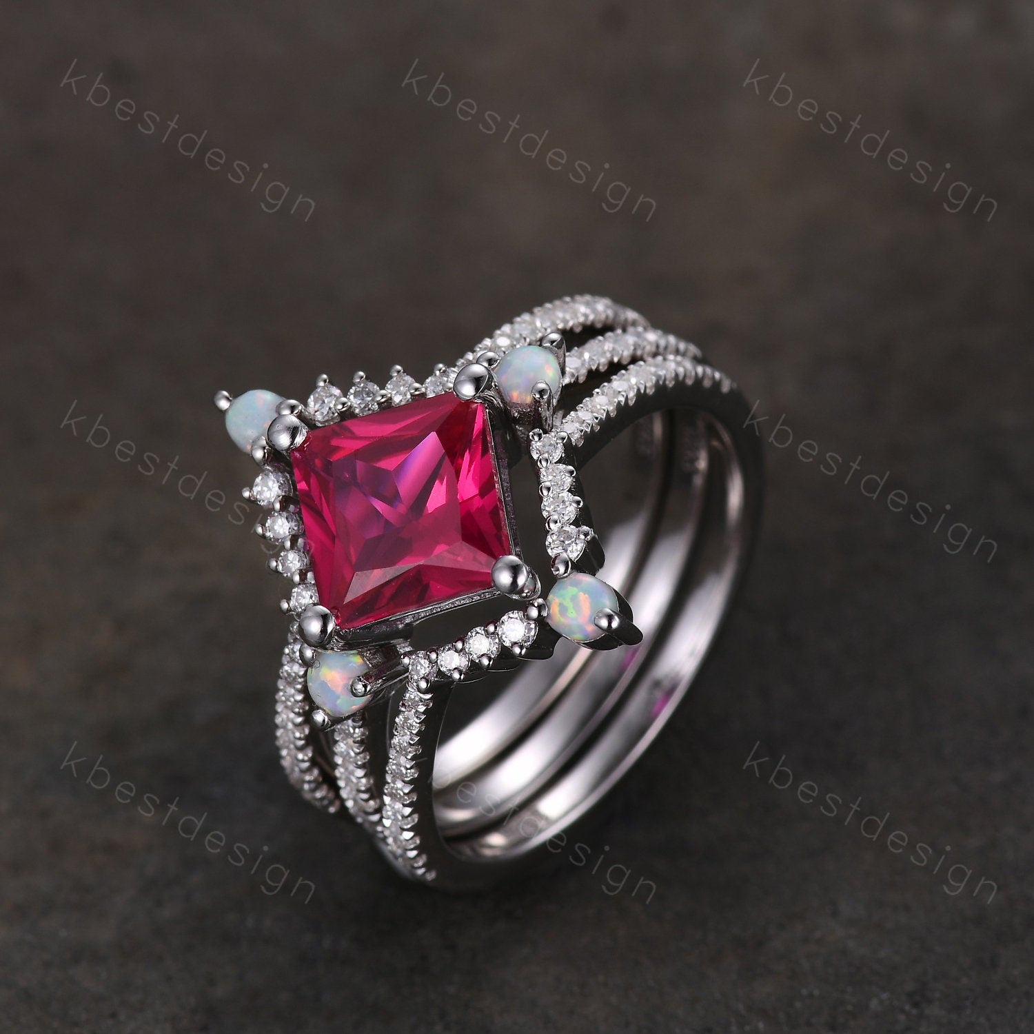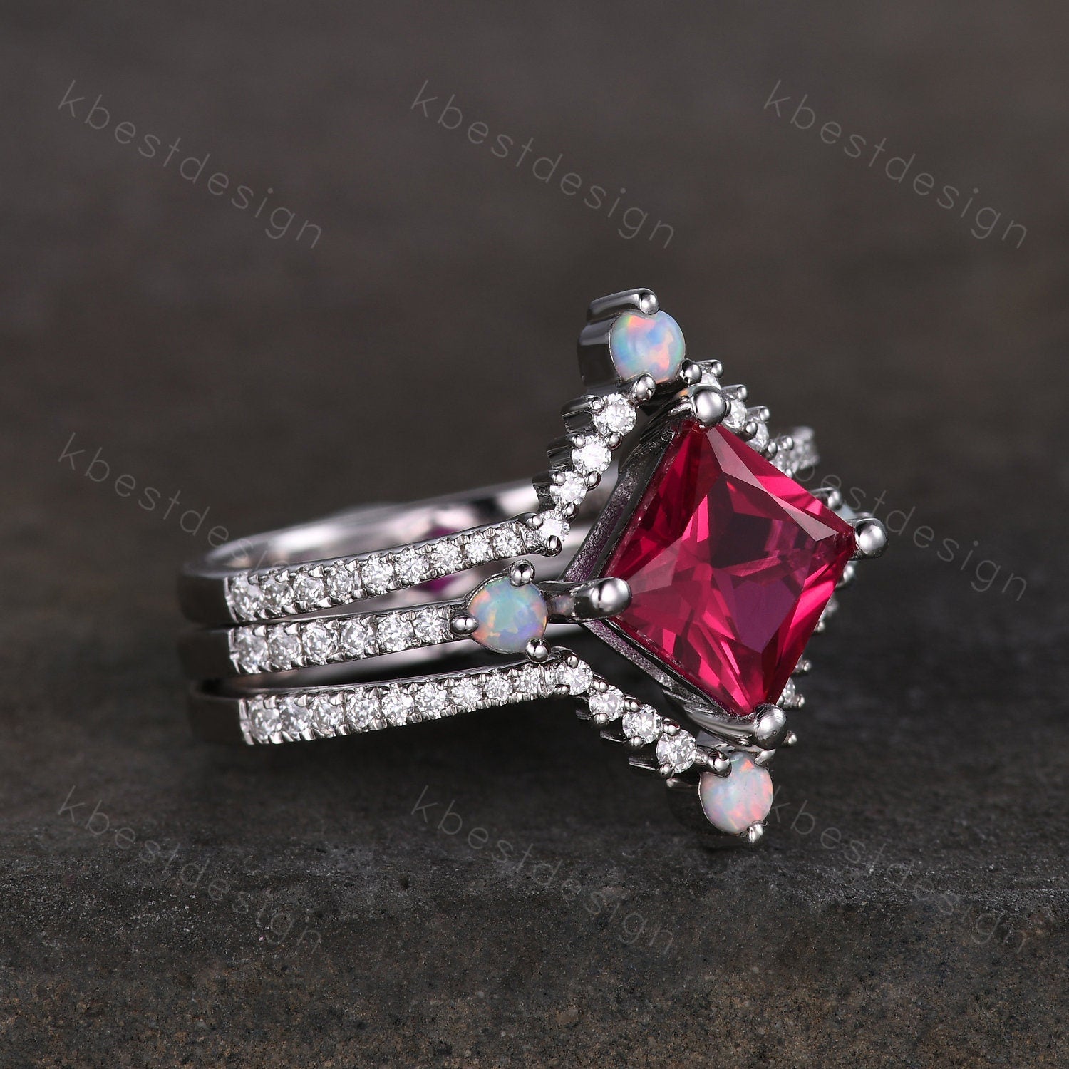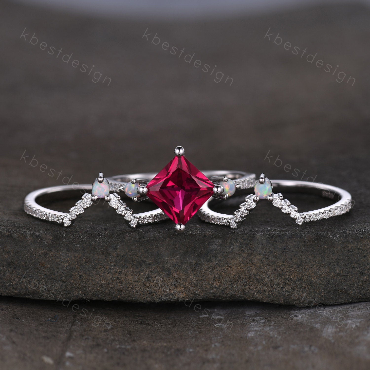 Vintage Unique princess cut Ruby engagement ring set sterling silver ring set curved opal moissanite stacking bands art deco wedding rings