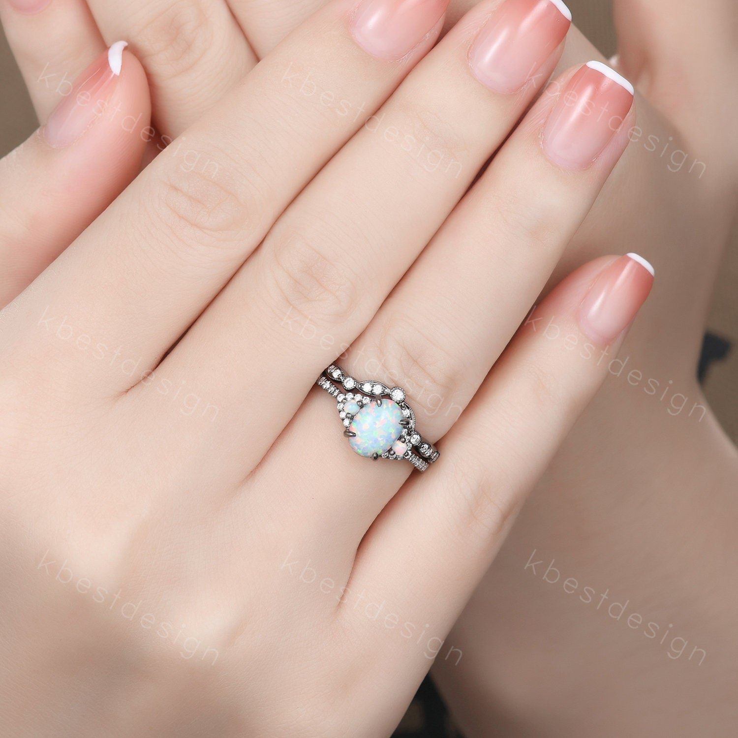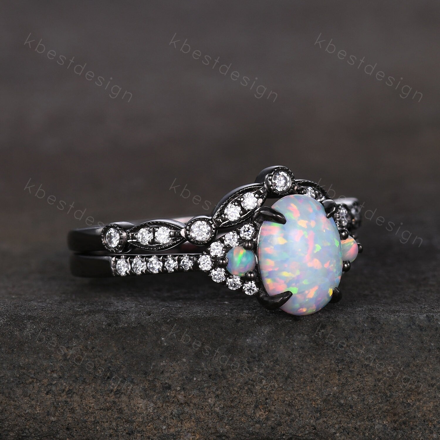 Vintage white opal engagement ring black gold rings art deco curved stacking matching band oval cut bridal set unique moissanite wedding set